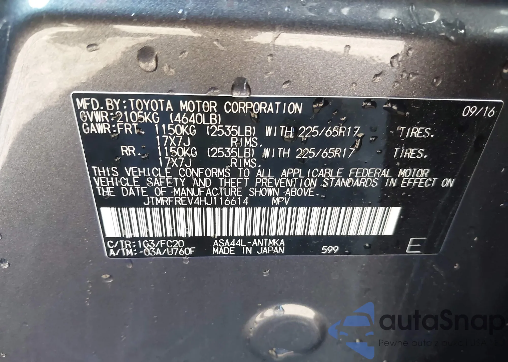 LOT: 43690742 VIN: JTMRFREV4HJ116614