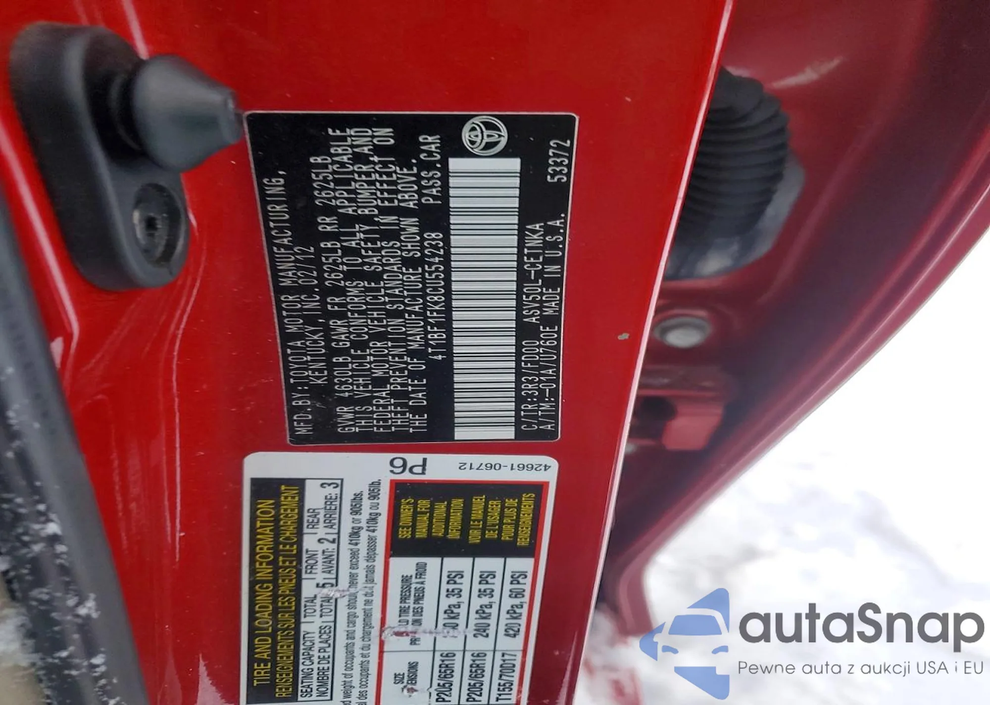 • VIN 4T1BF1FK8CU554238