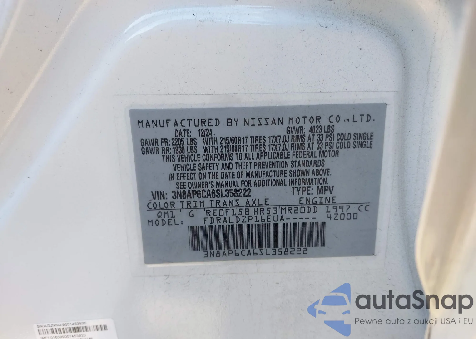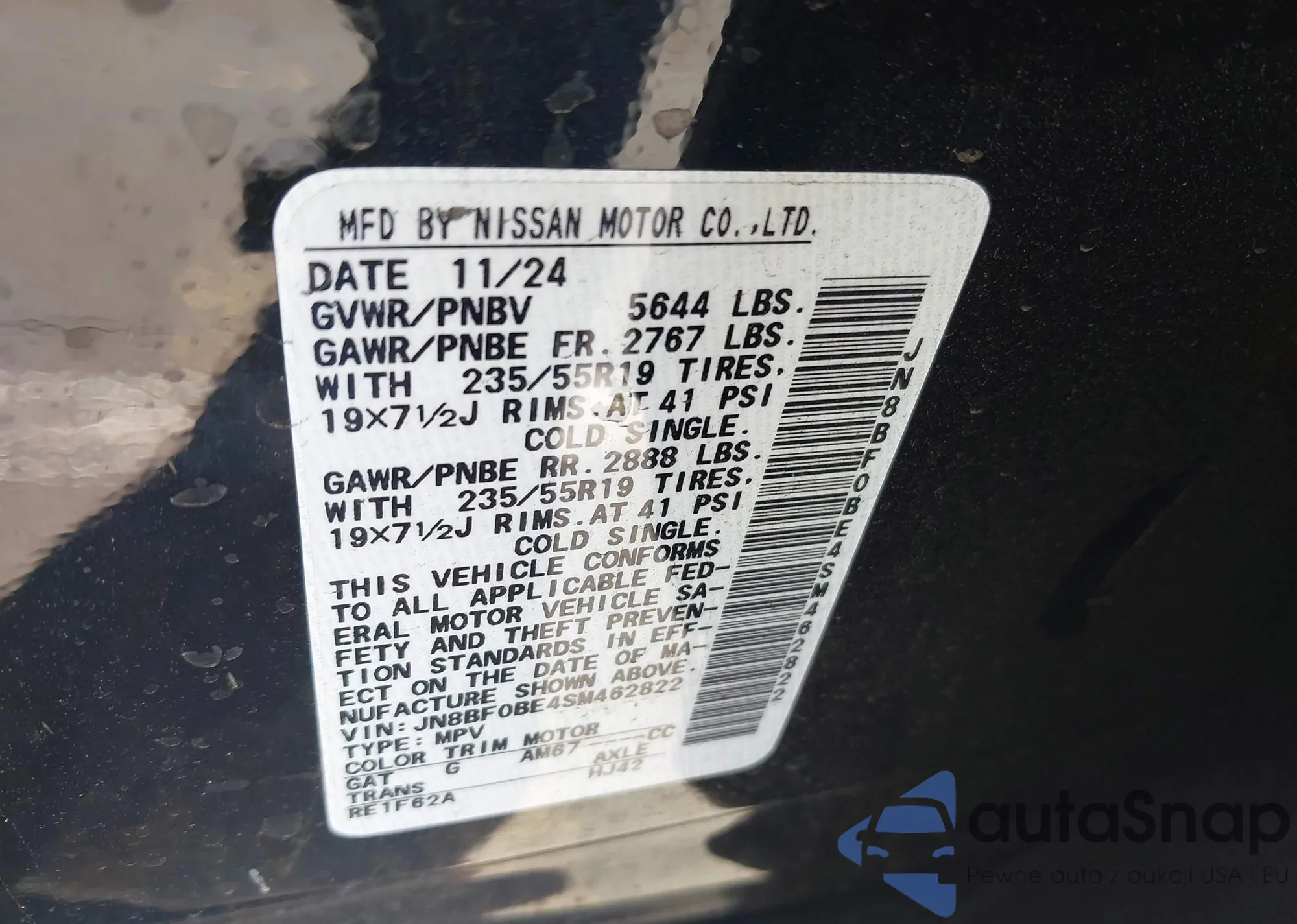 LOT: 43448416 VIN: JN8BF0BE4SM462822
