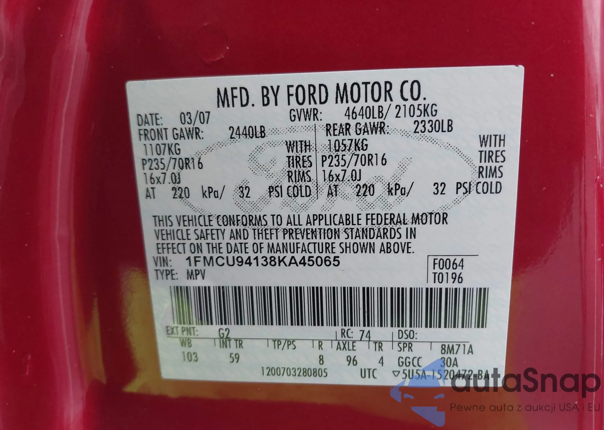 • VIN 1FMCU94138KA45065