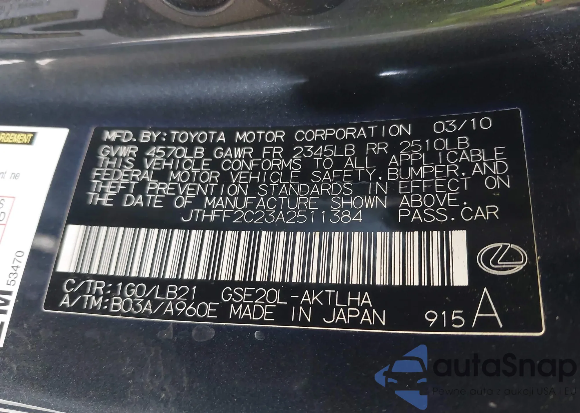 LOT: 44233777 VIN: JTHFF2C23A2511384