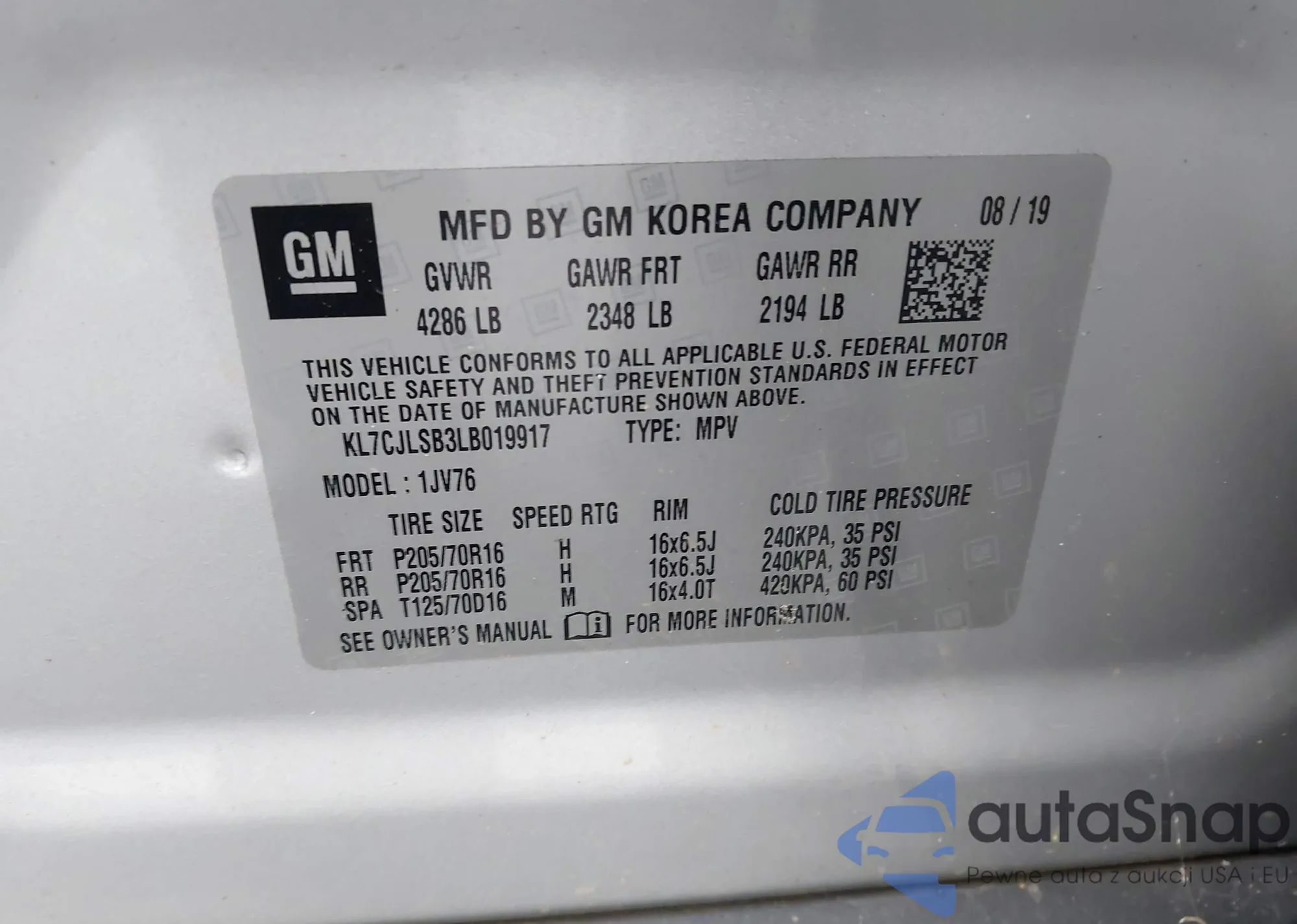 LOT: 43976974 VIN: KL7CJLSB3LB019917