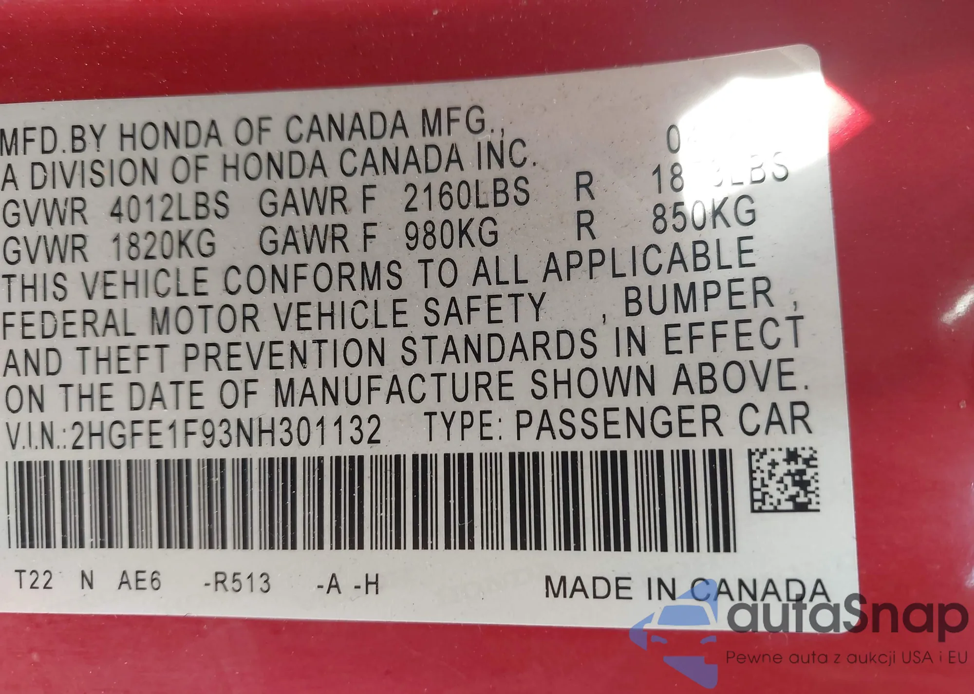 • VIN 2HKYF18506H504096