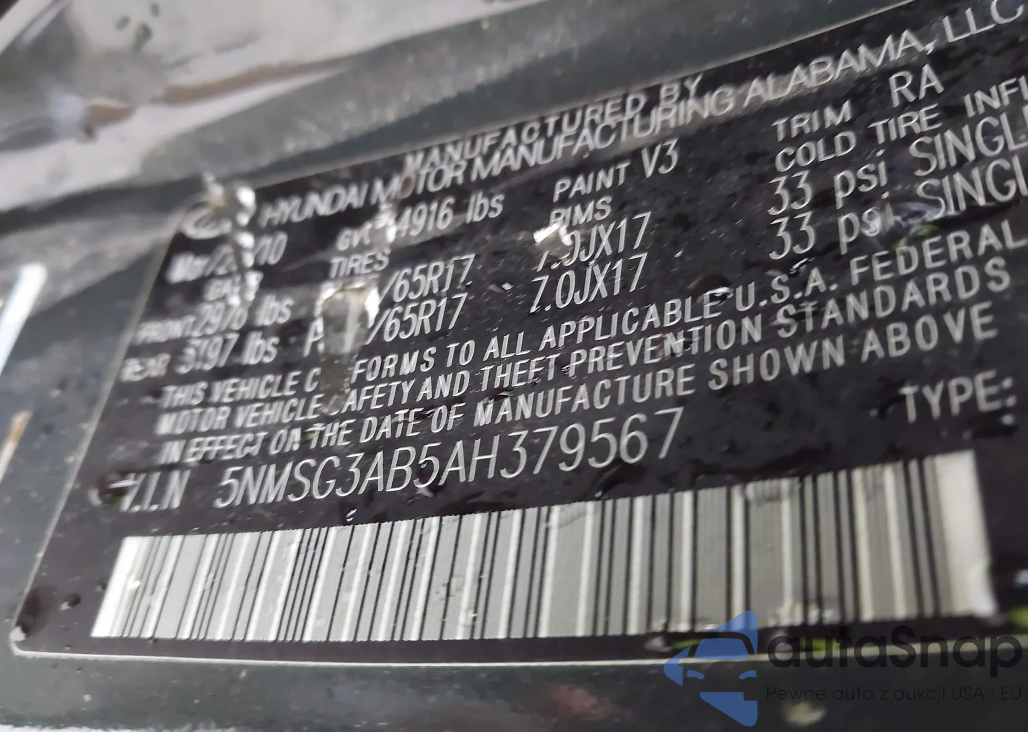 • VIN 5NMSG3AB5AH379567