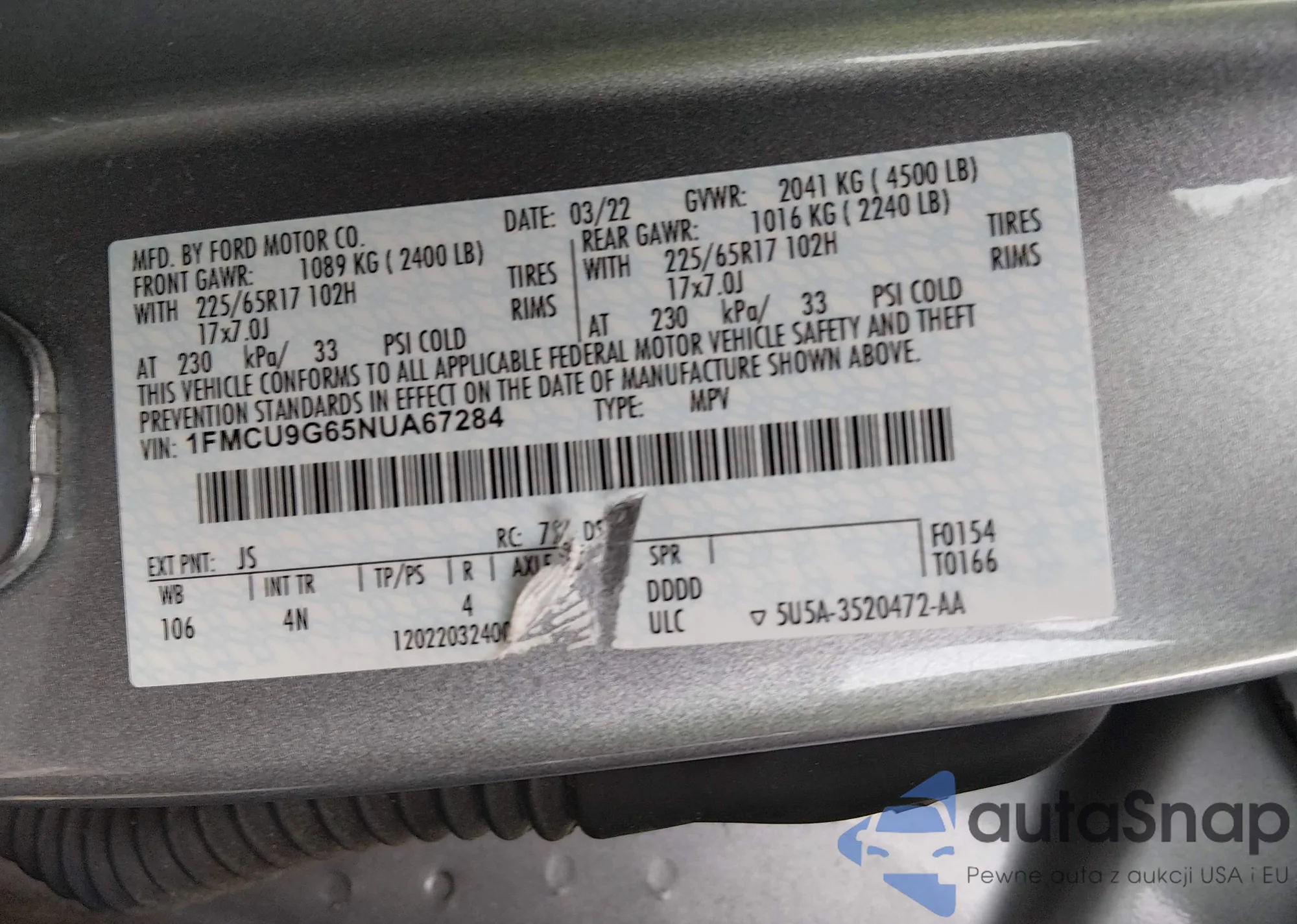 LOT: 44109280 VIN: 5NMSG3AB5AH379567