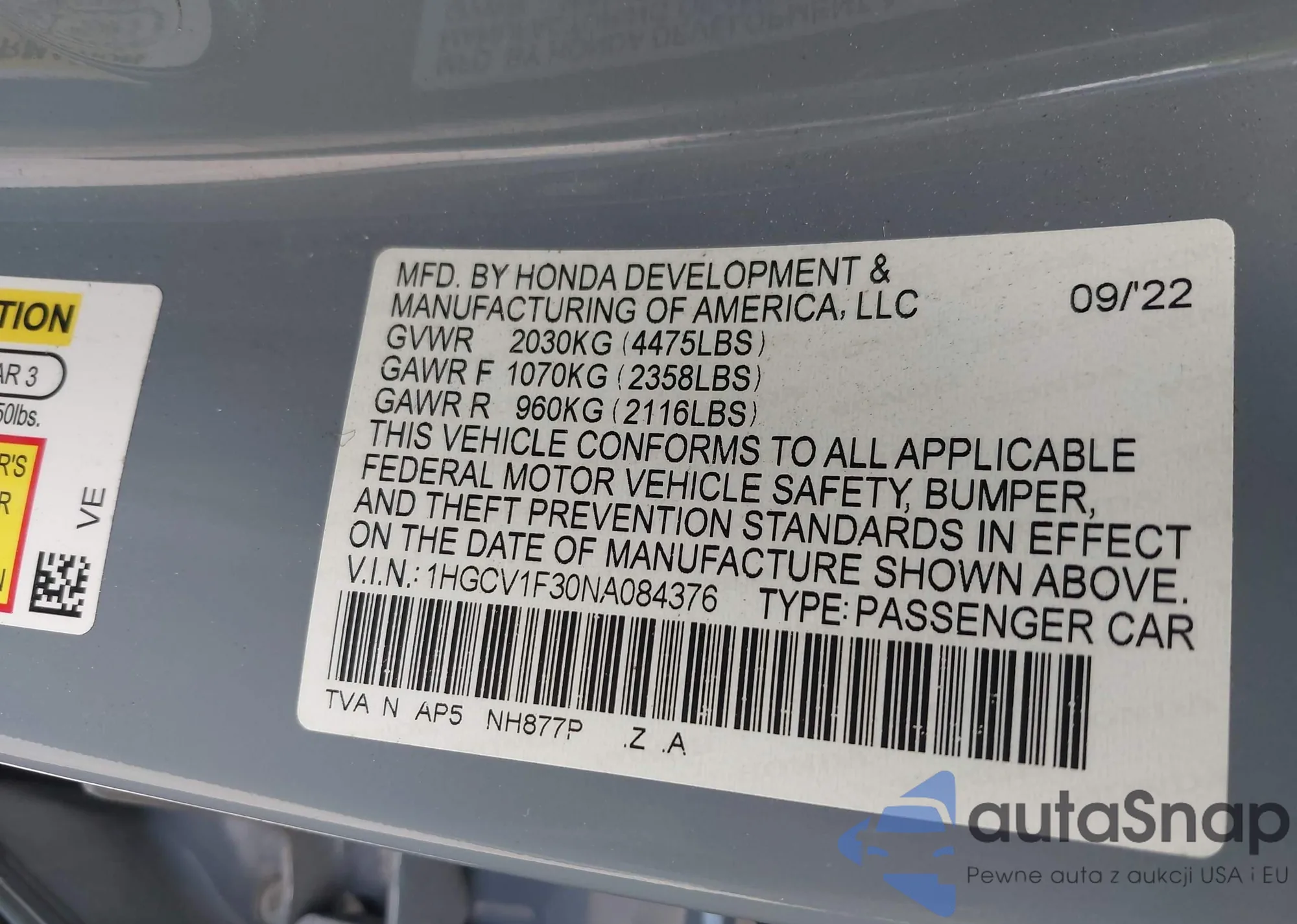 LOT: 43695673 VIN: 1HGCV1F30NA084376