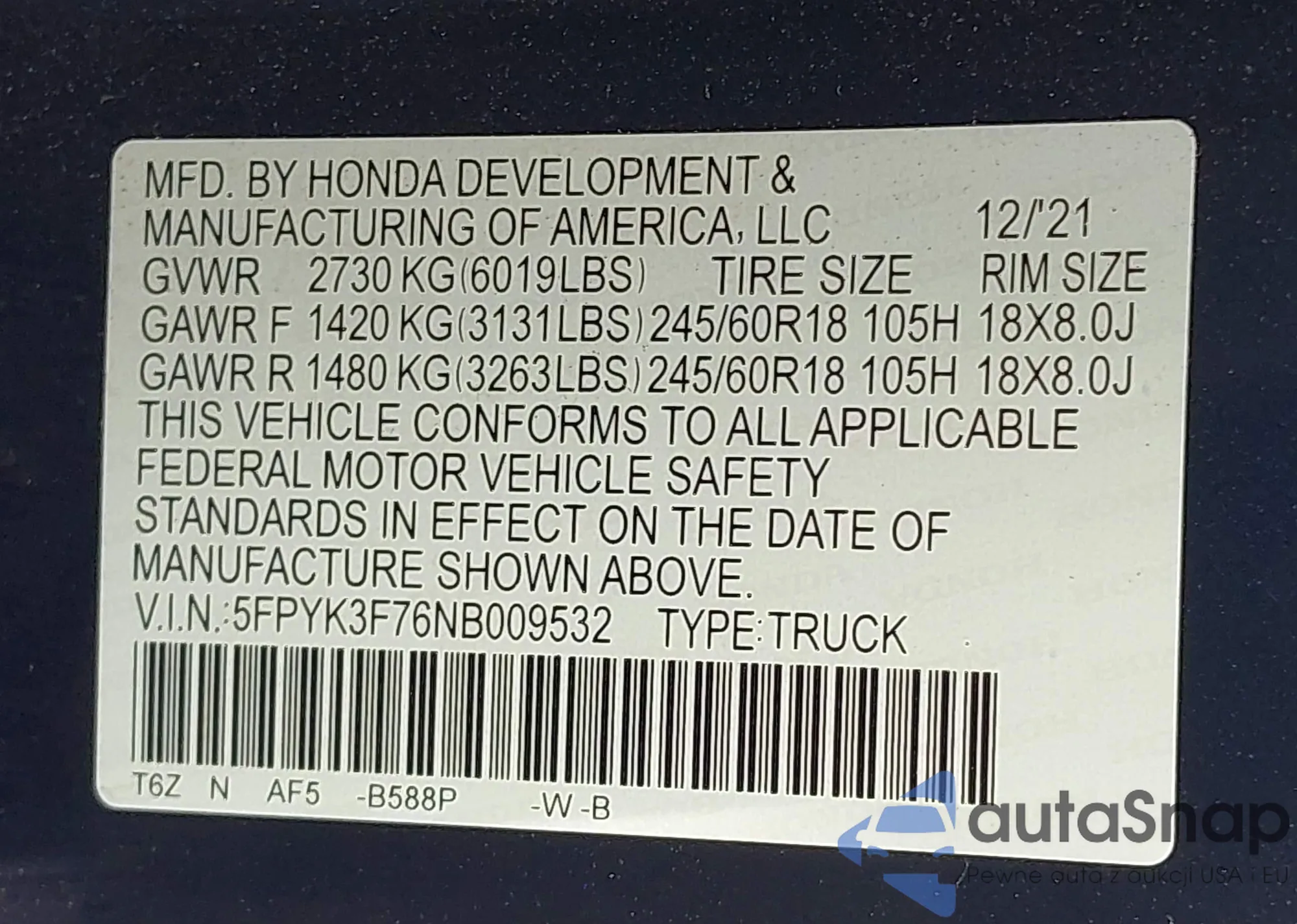 • VIN 5FPYK3F76NB009532