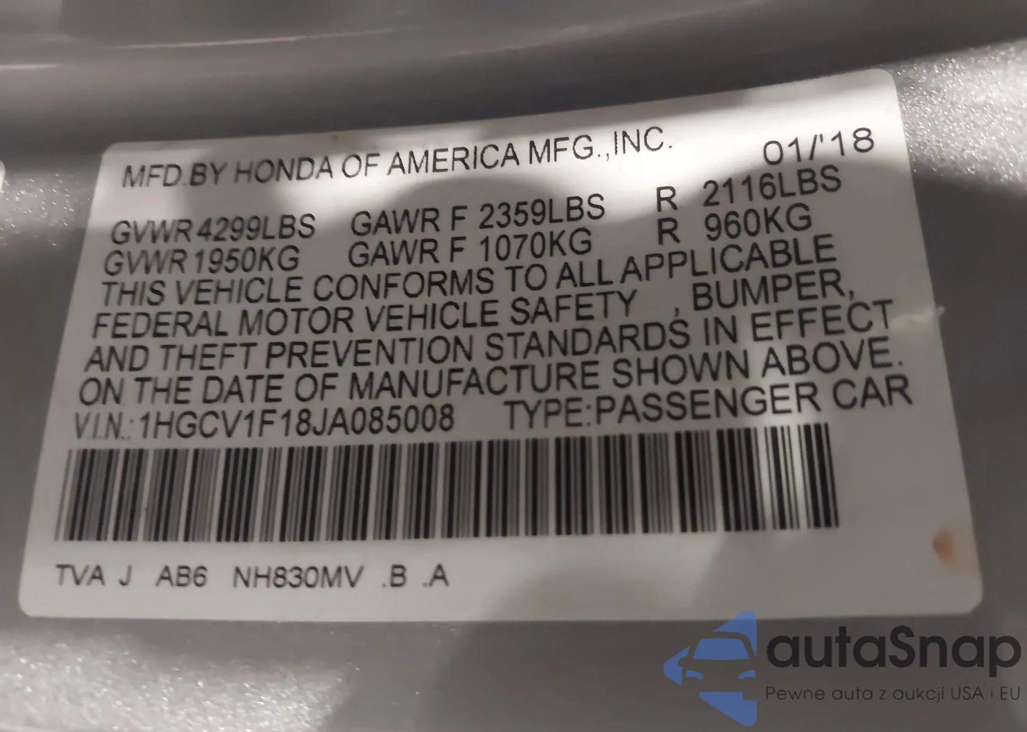 LOT: 43857265 VIN: 1HGCV1F18JA085008