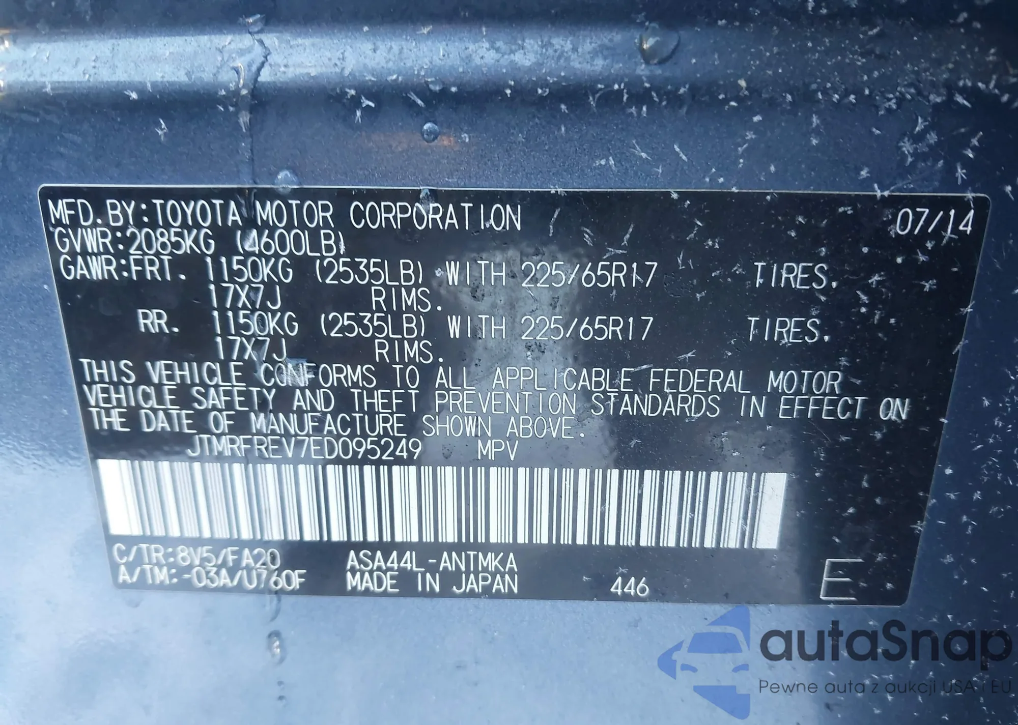 LOT: 43934966 VIN: JTMRFREV7ED095249