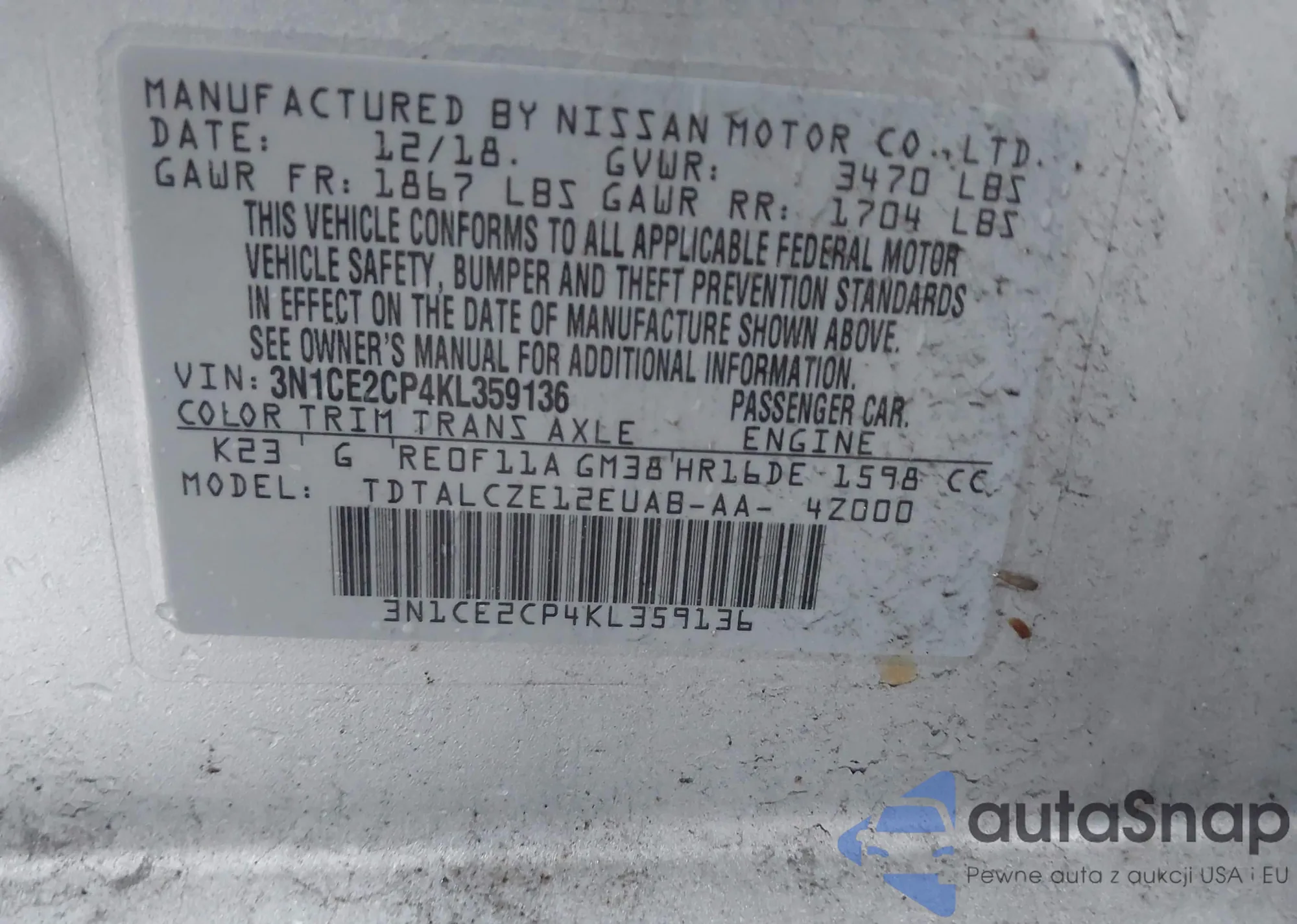 • VIN 3N1CE2CP4KL359136