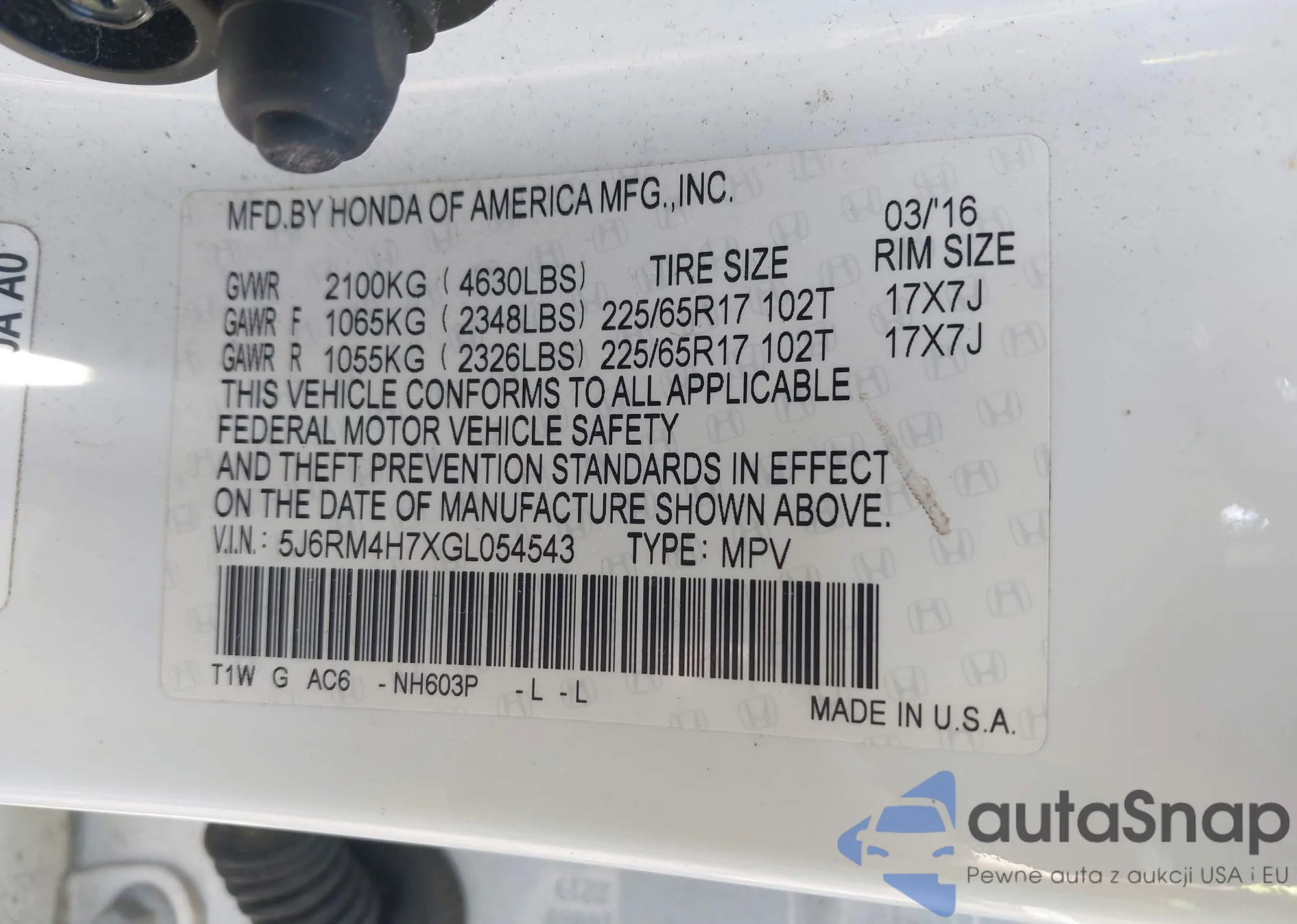 • VIN 5J6RM4H7XGL054543