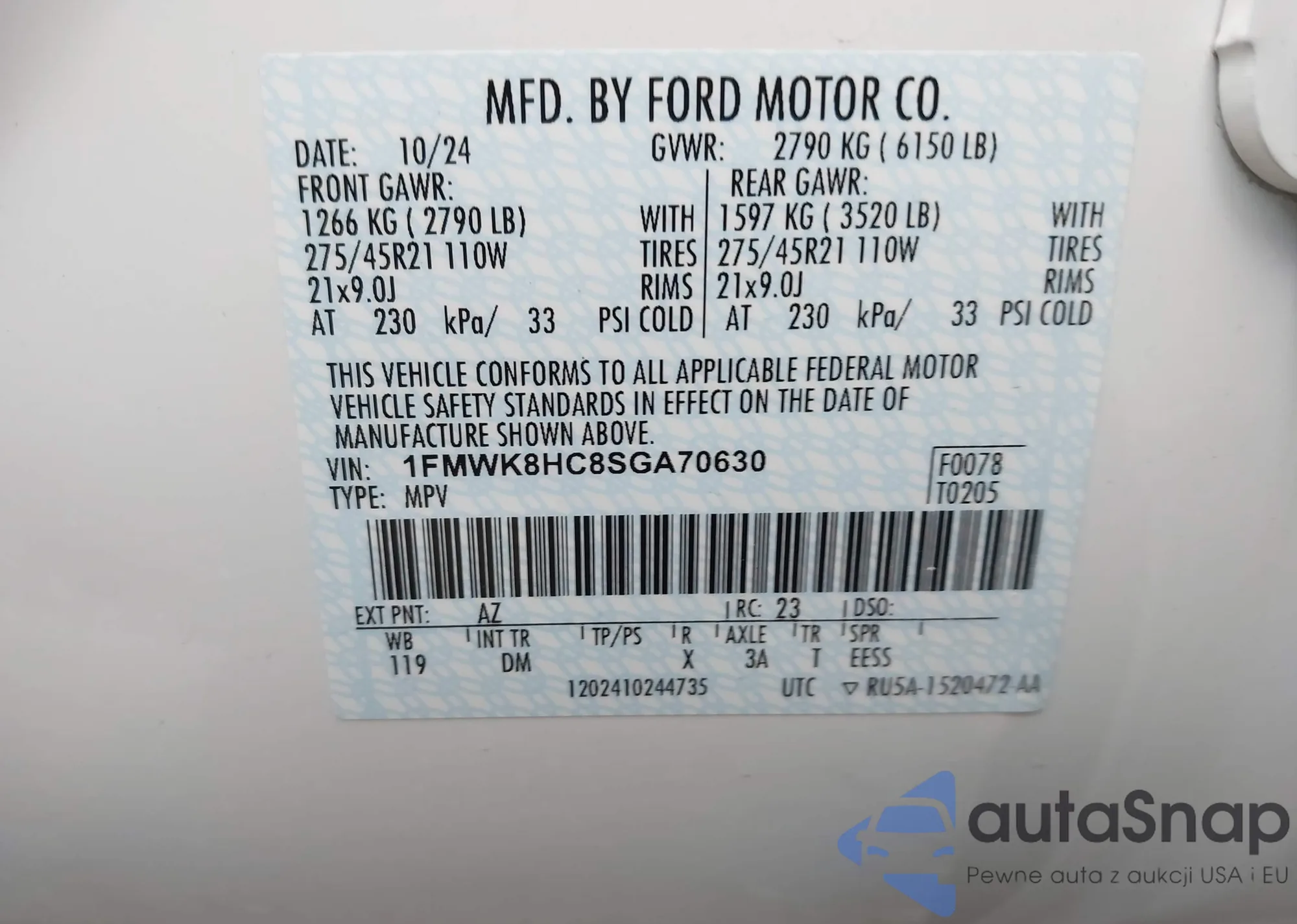 LOT: 43948370 VIN: 1FMWK8HC8SGA70630