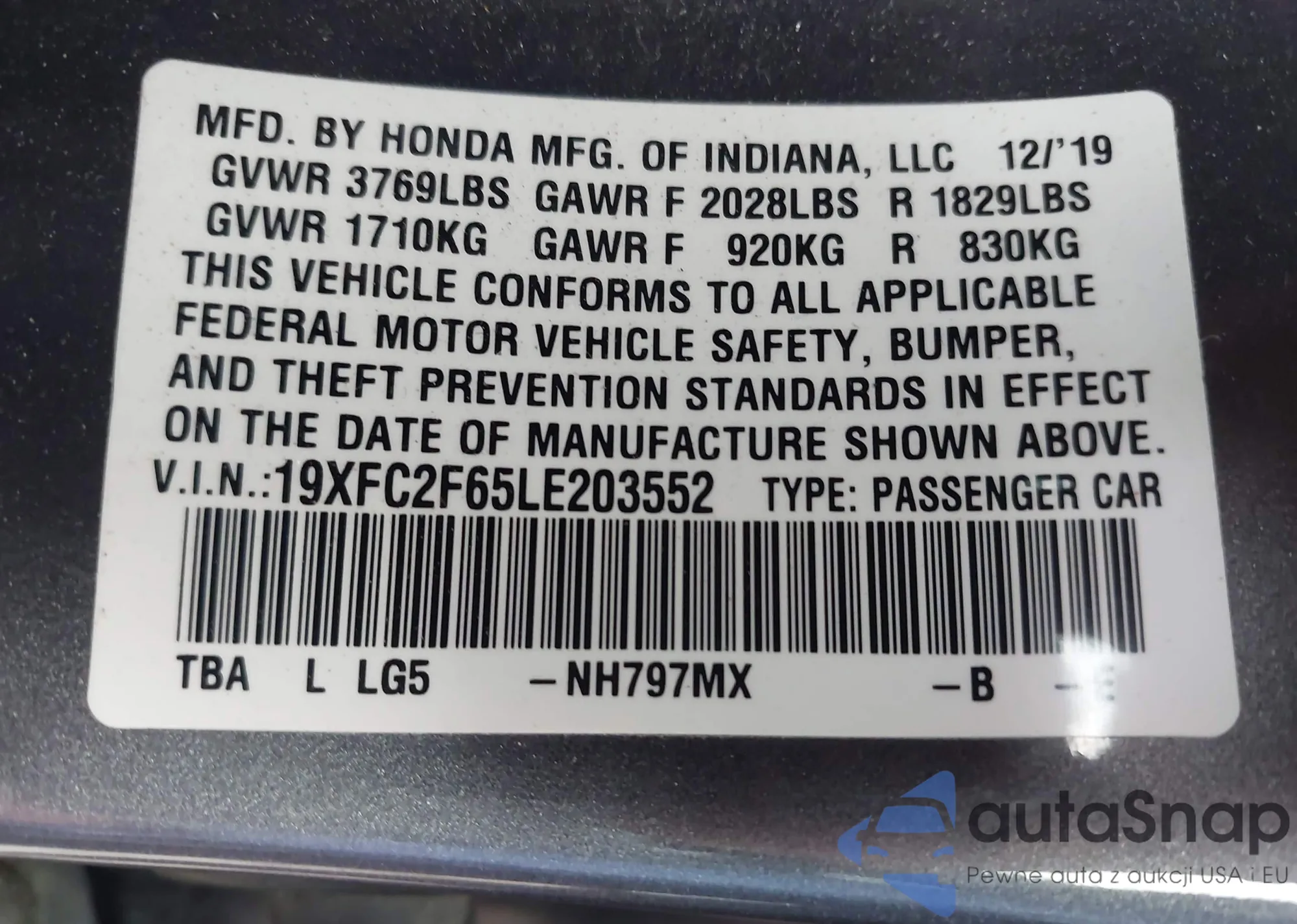 LOT: 43541869 VIN: 19XFC2F65LE203552