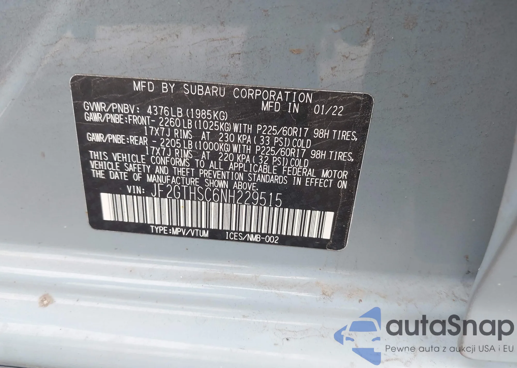 LOT: 43719858 VIN: JF2GTHSC6NH229515