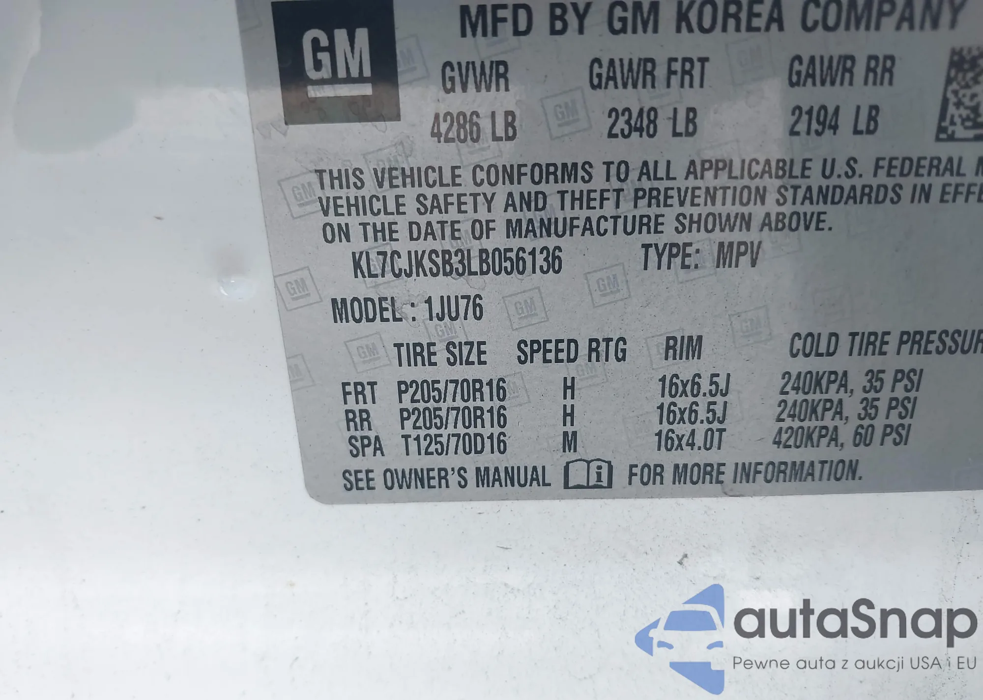 • VIN KL7CJKSB3LB056136