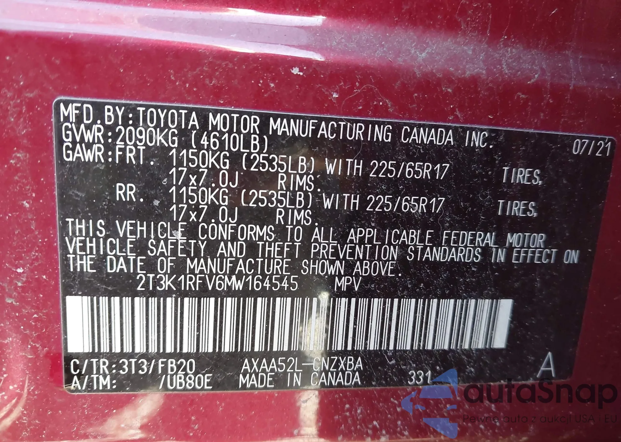 LOT: 43955229 VIN: 2T3K1RFV6MW164545