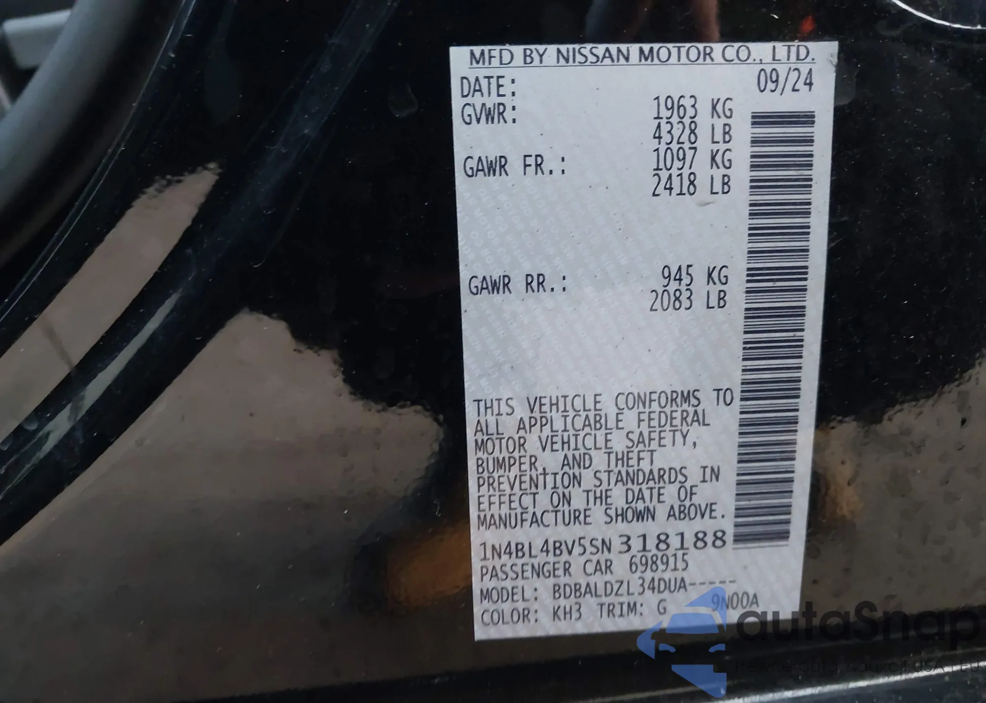 • VIN 1N4BL4BV5SN318188