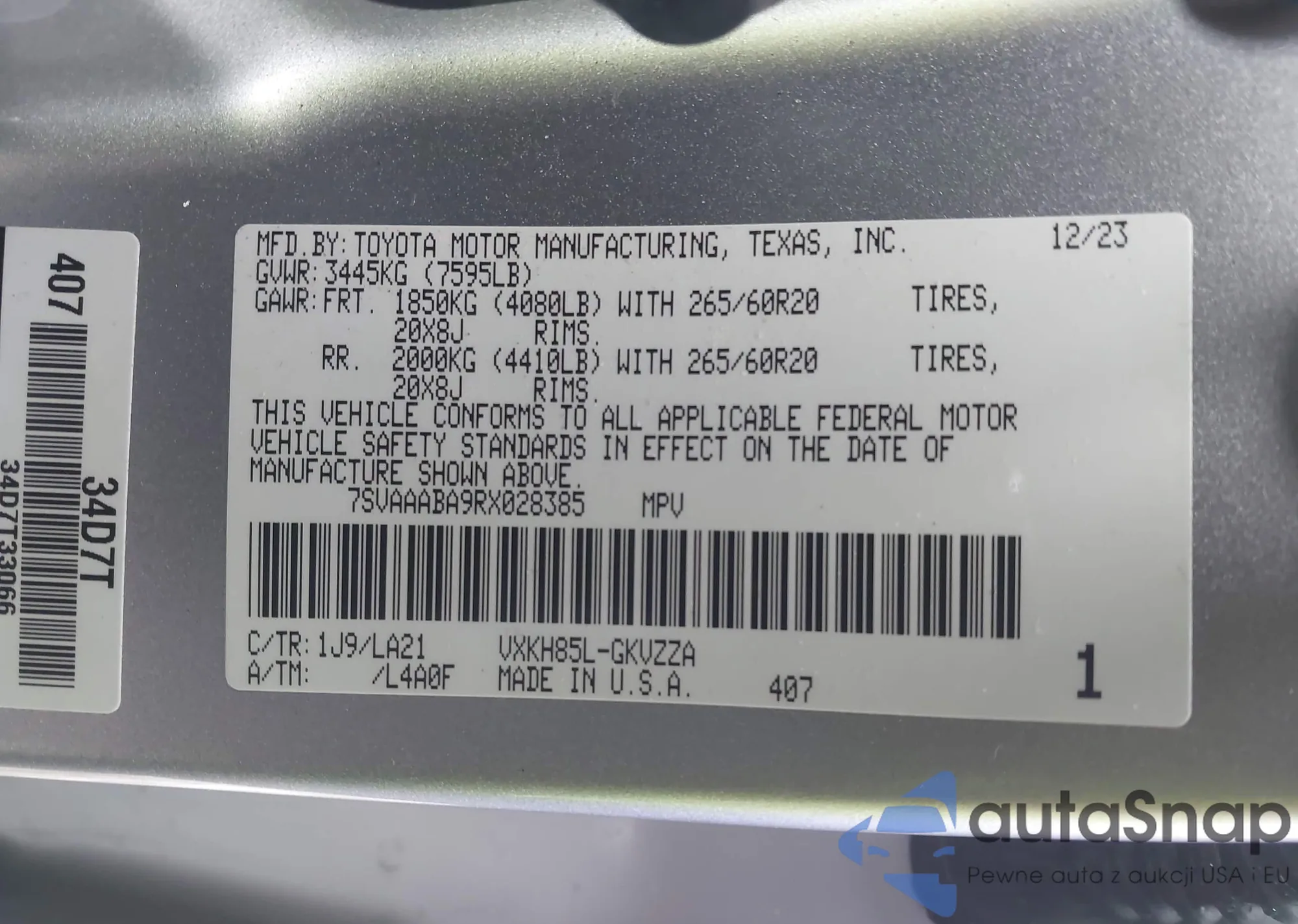 LOT: 44220317 VIN: SALYL2EX8SA809683