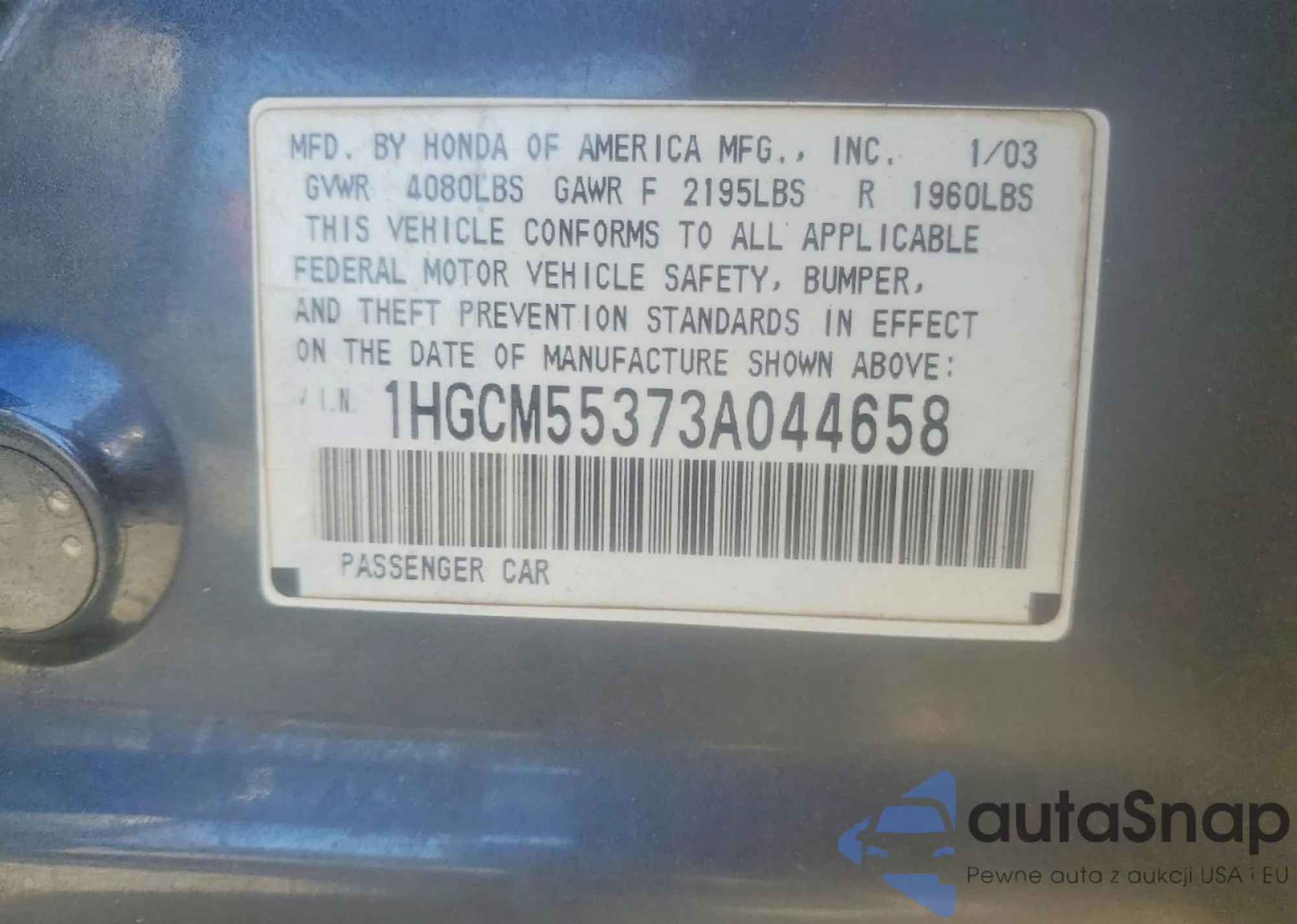 LOT: 74350585 VIN: 1HGCM55373A044658