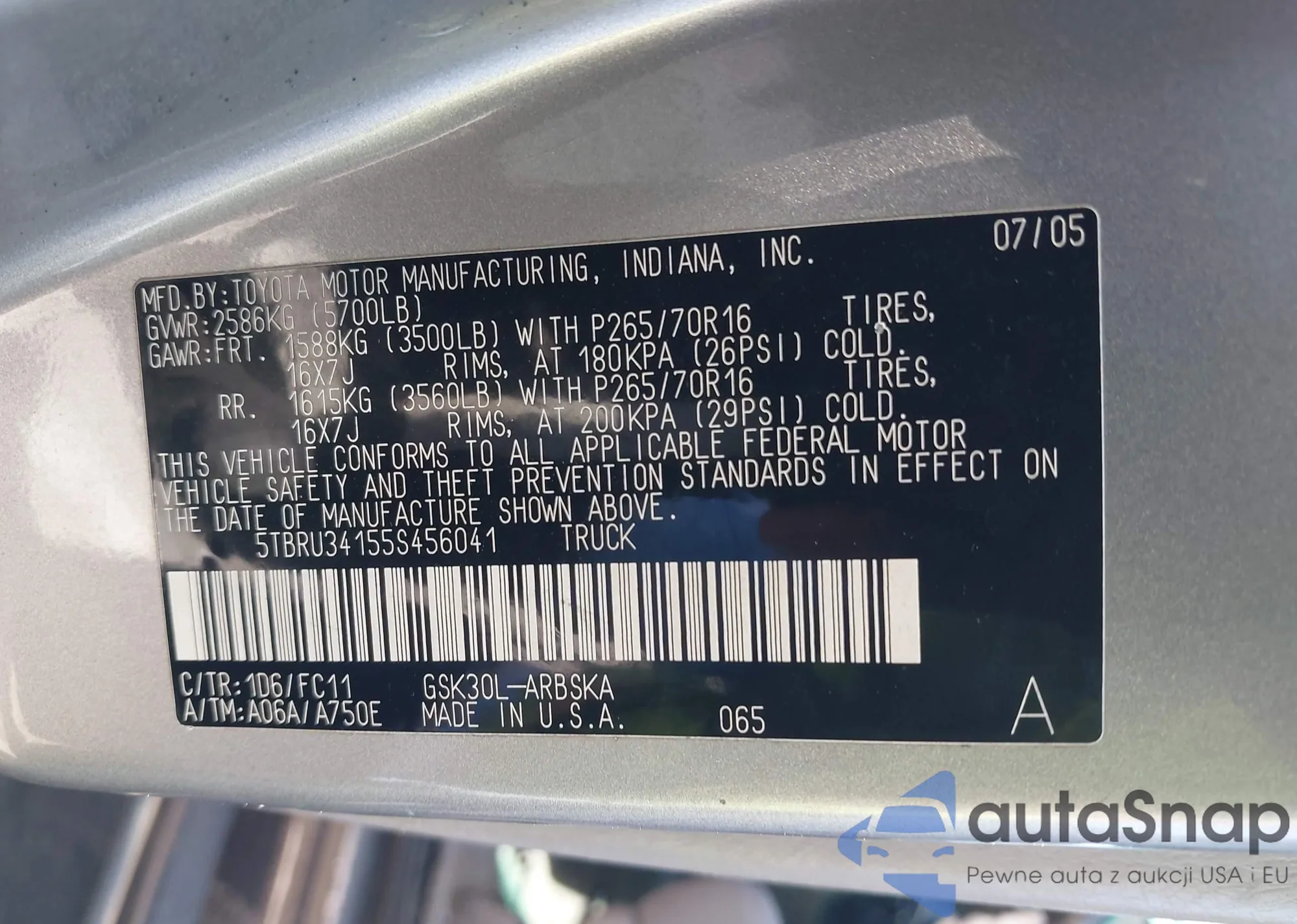 LOT: 43261135 VIN: 5TBRU34155S456041