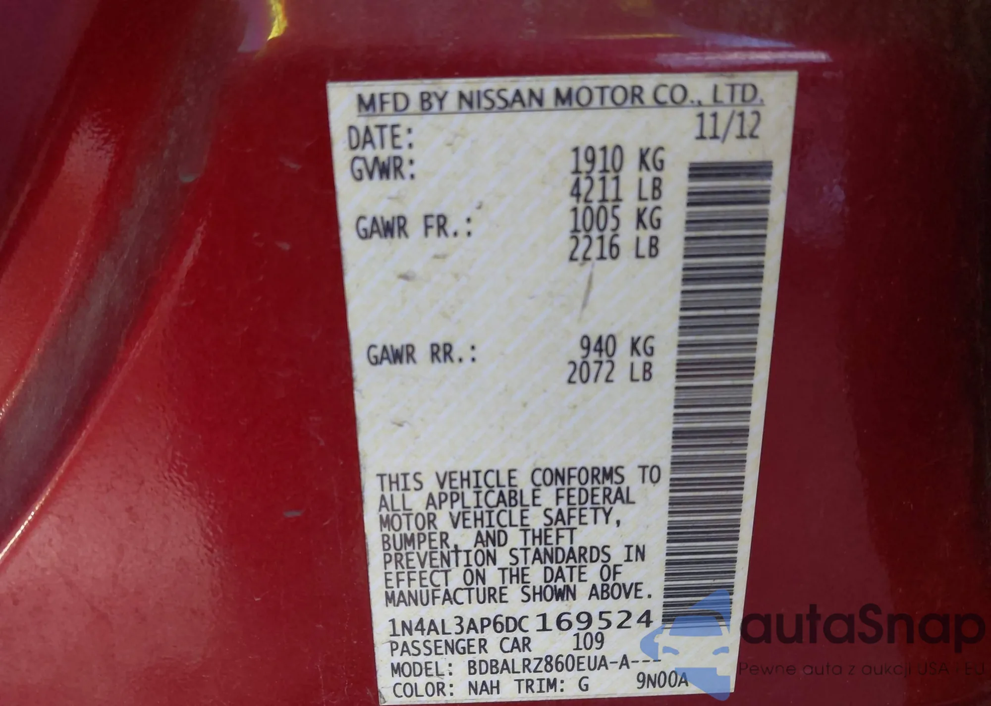 LOT: 44140522 VIN: 1N4AL3AP6DC169524