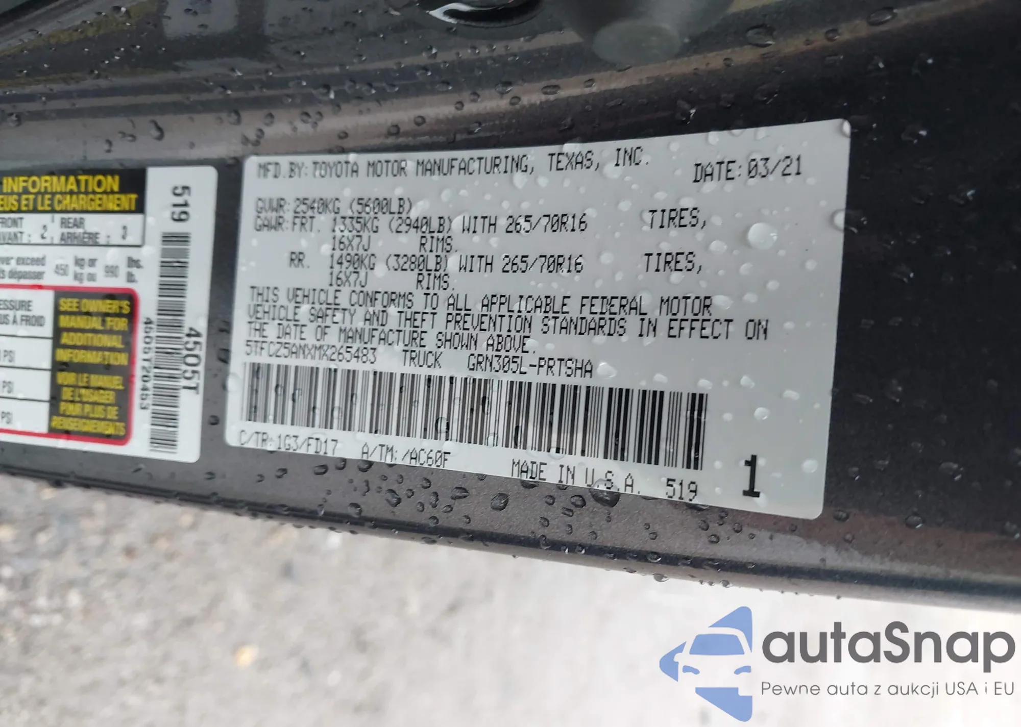 • VIN 5TFCZ5ANXMX265483