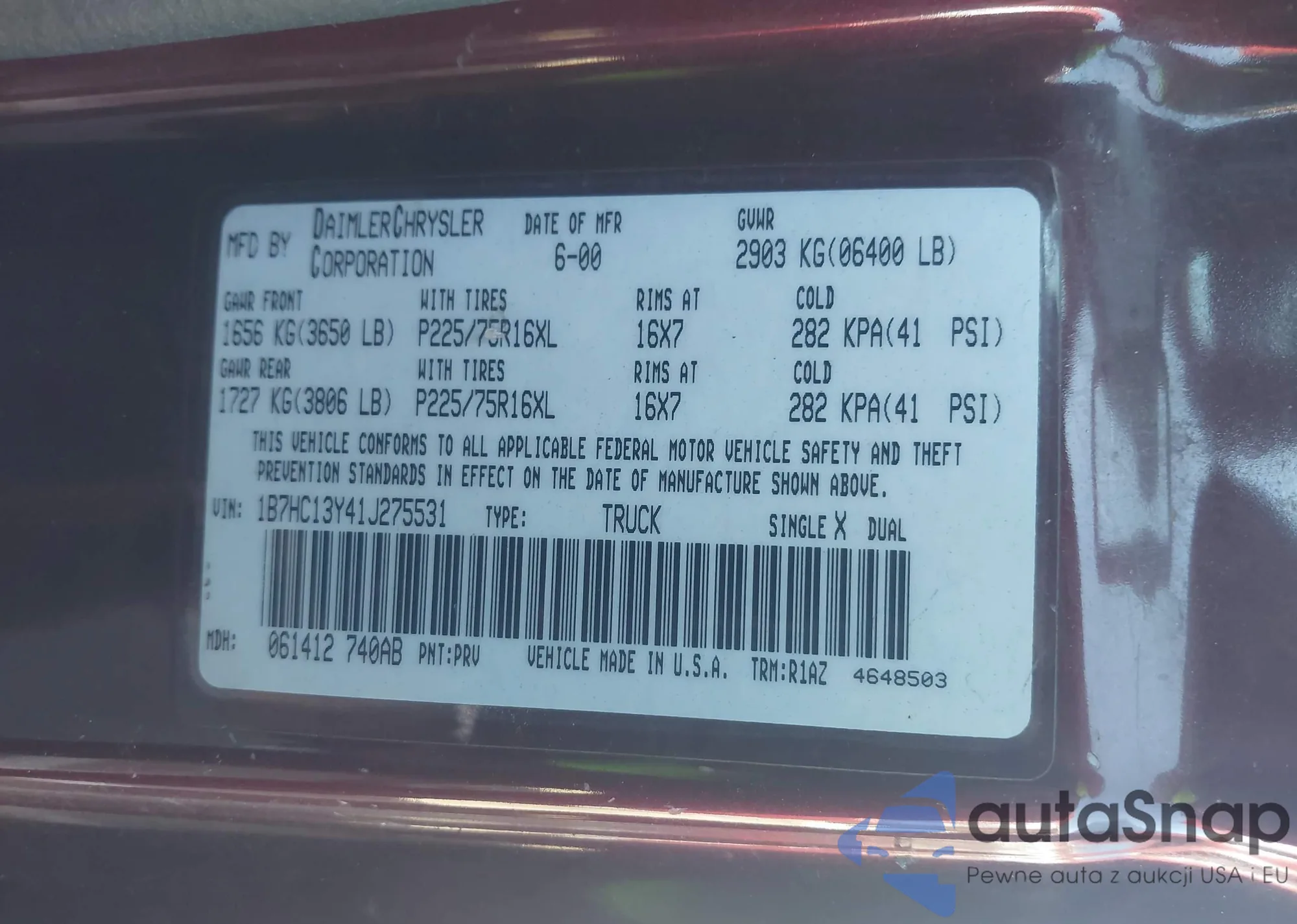 • VIN 1B7HC13Y41J275531