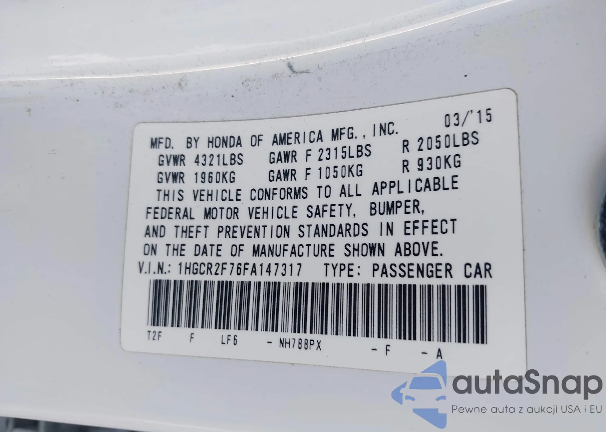 LOT: 44306860 VIN: 1HGCR2F76FA147317