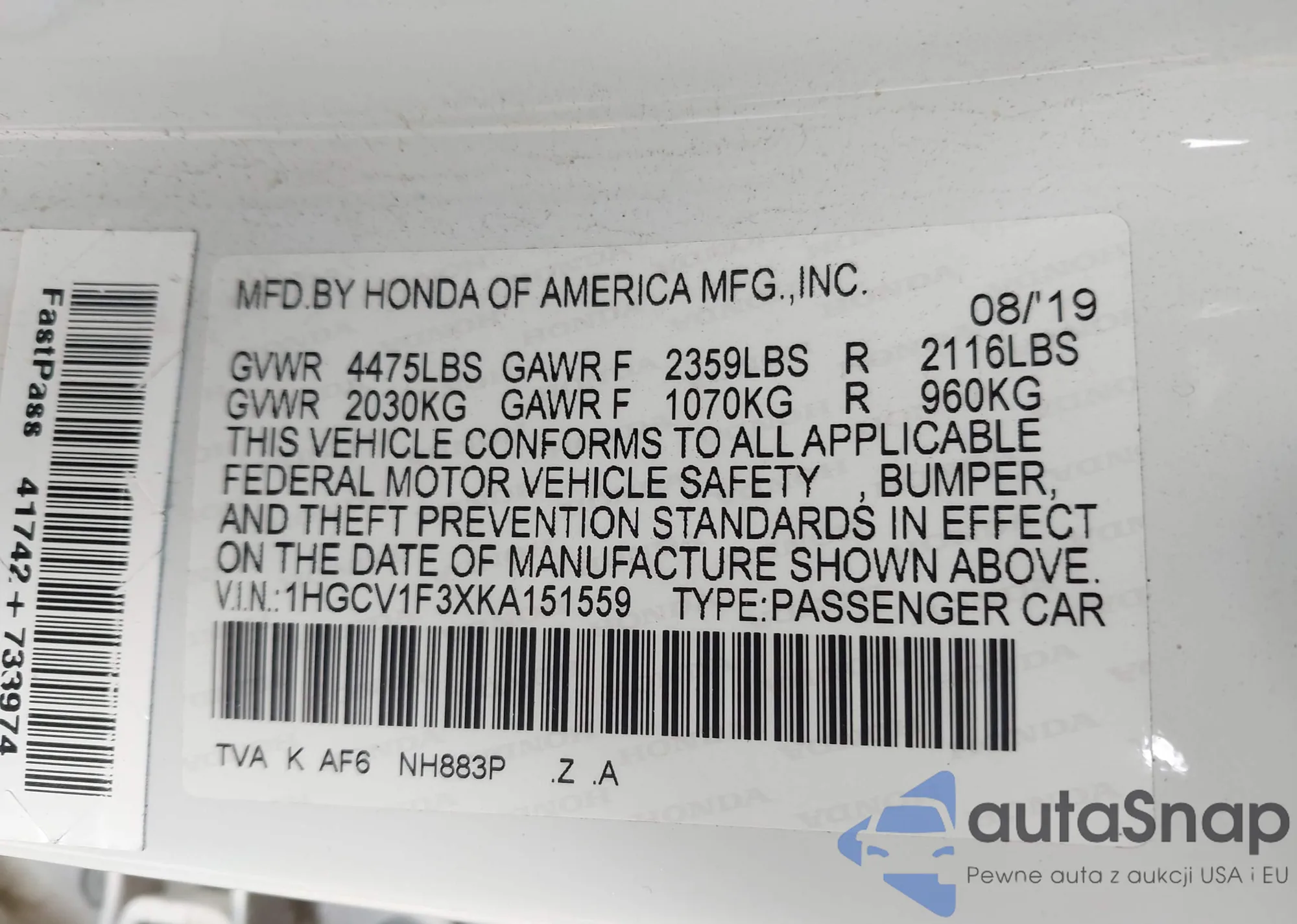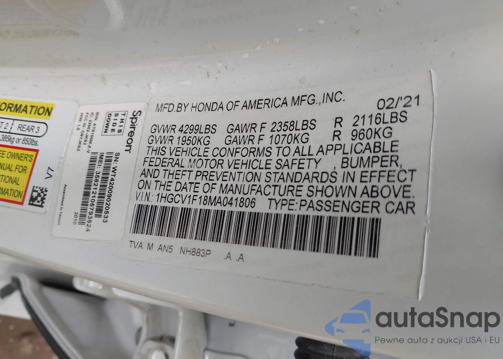 LOT: 44337182 VIN: 1HGCV1F18MA041806