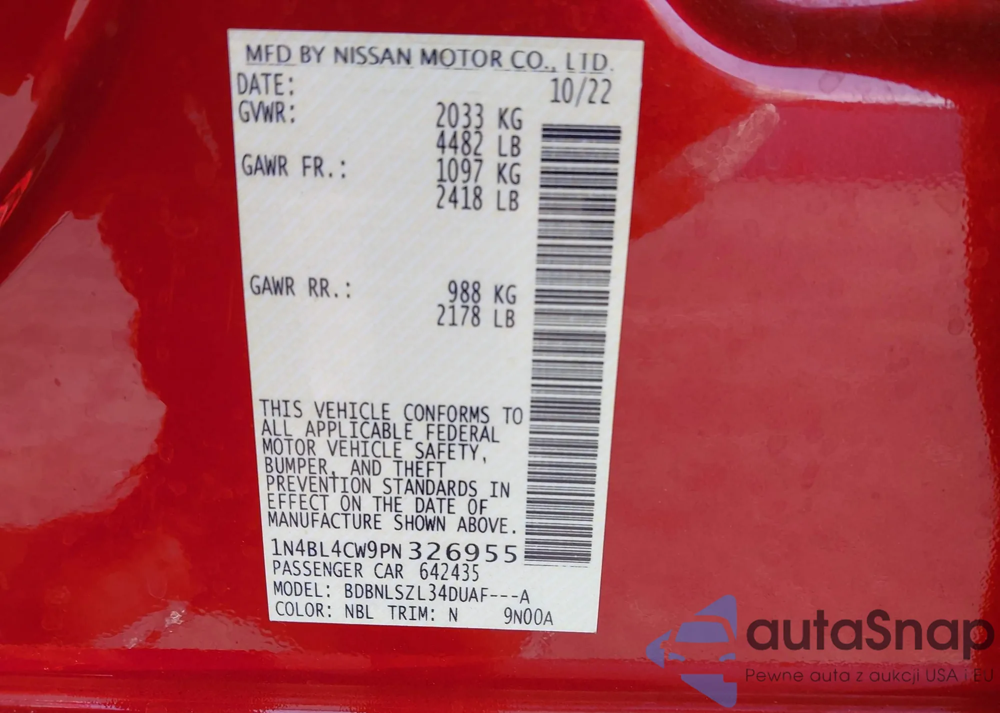 • VIN 1N4BL4CW9PN326955