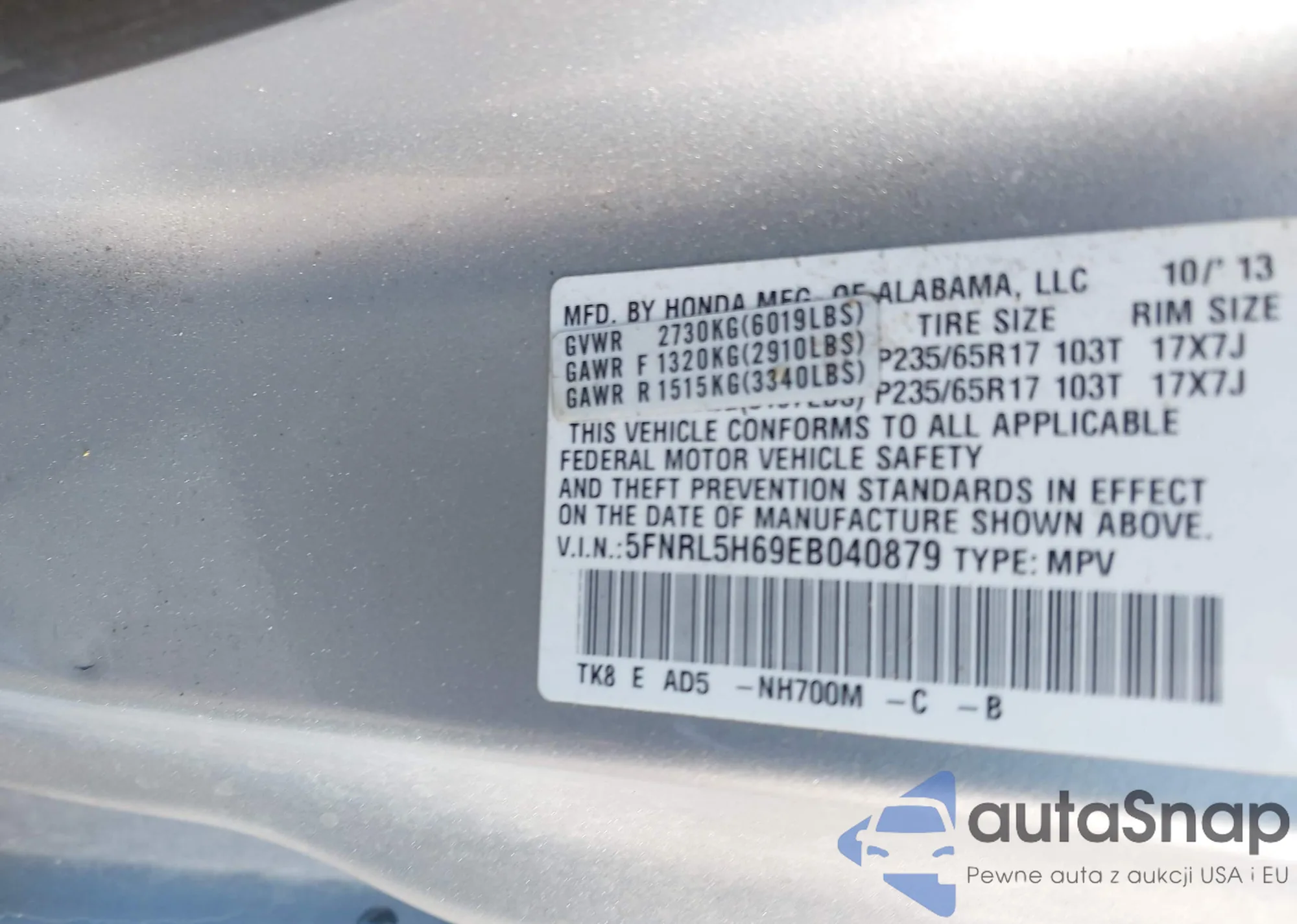 • VIN 5FNRL5H69EB040879