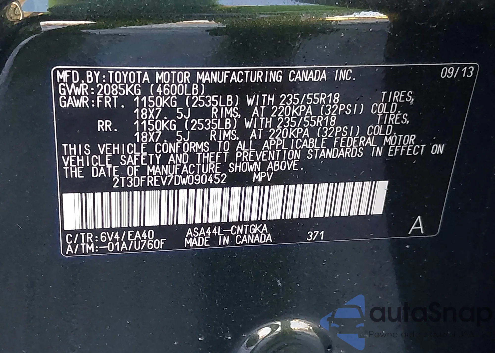 LOT: 43965462 VIN: 2T3DFREV7DW090452