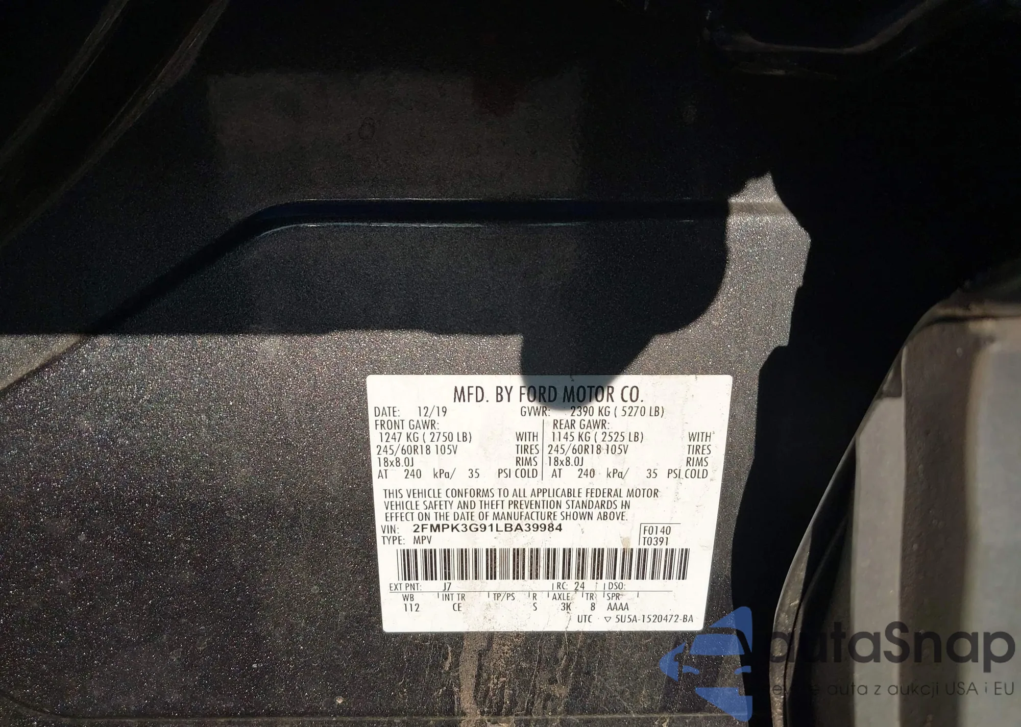 LOT: 43805947 VIN: 2FMPK3G91LBA39984