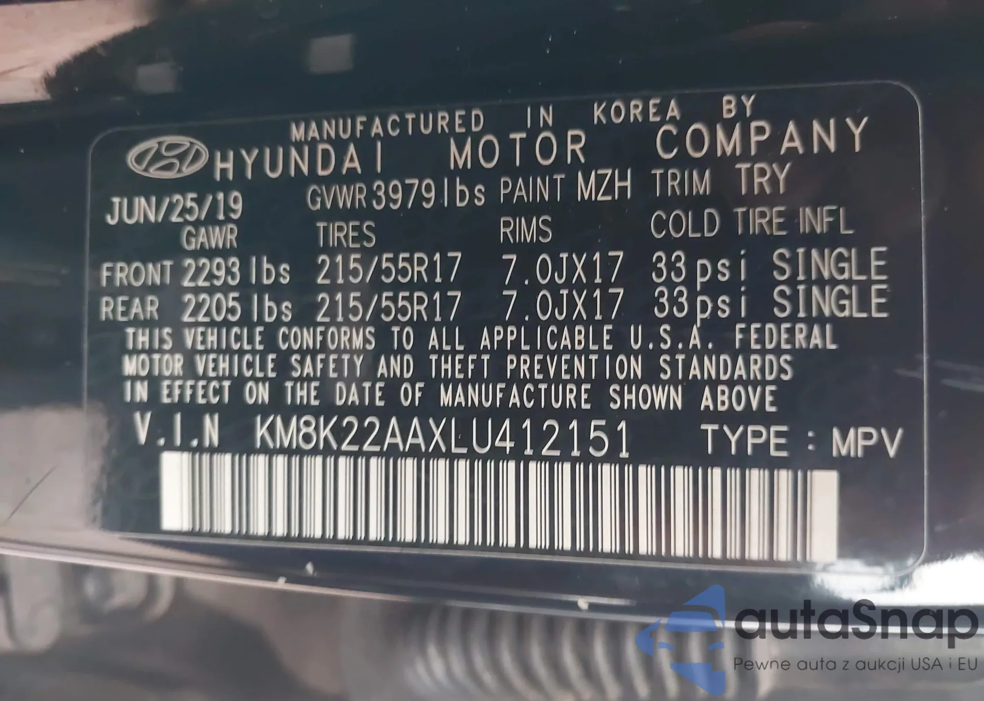 • VIN KM8K22AAXLU412151