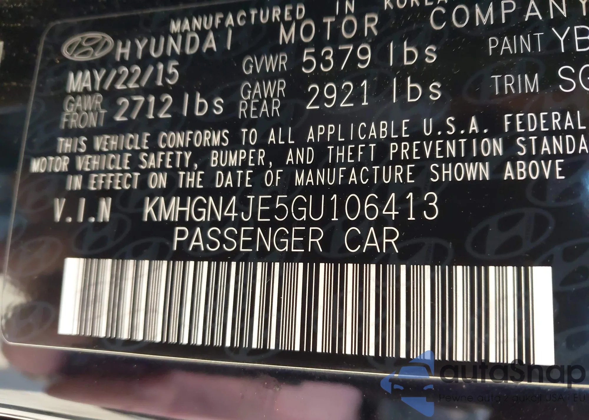 LOT: 44027177 VIN: KMHGN4JE5GU106413