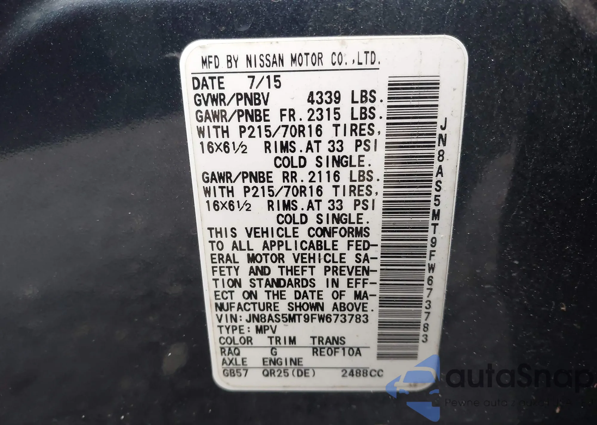 LOT: 44201677 VIN: JN8AS5MT9FW673783