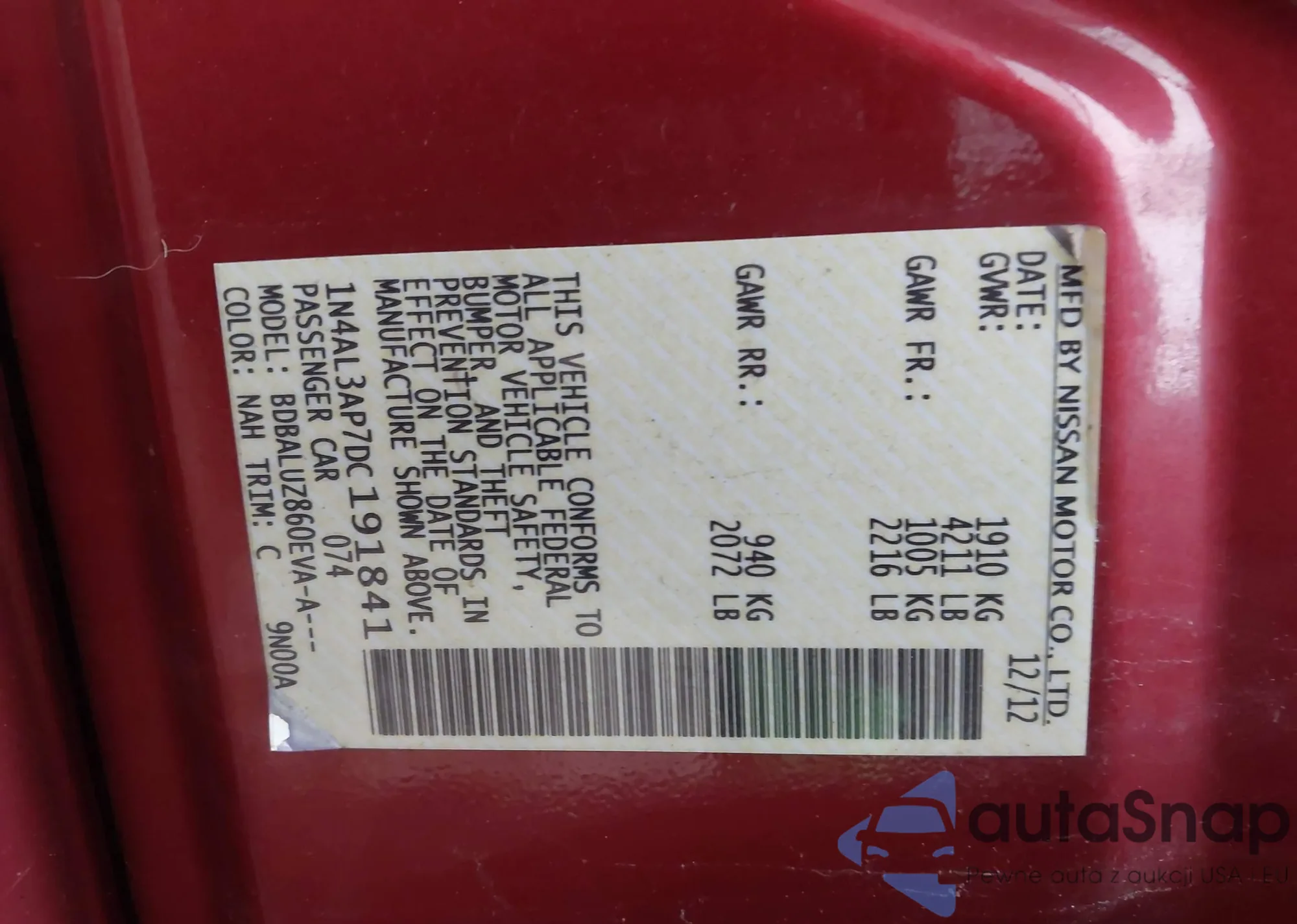 LOT: 44092450 VIN: 1N4AL3AP7DC191841
