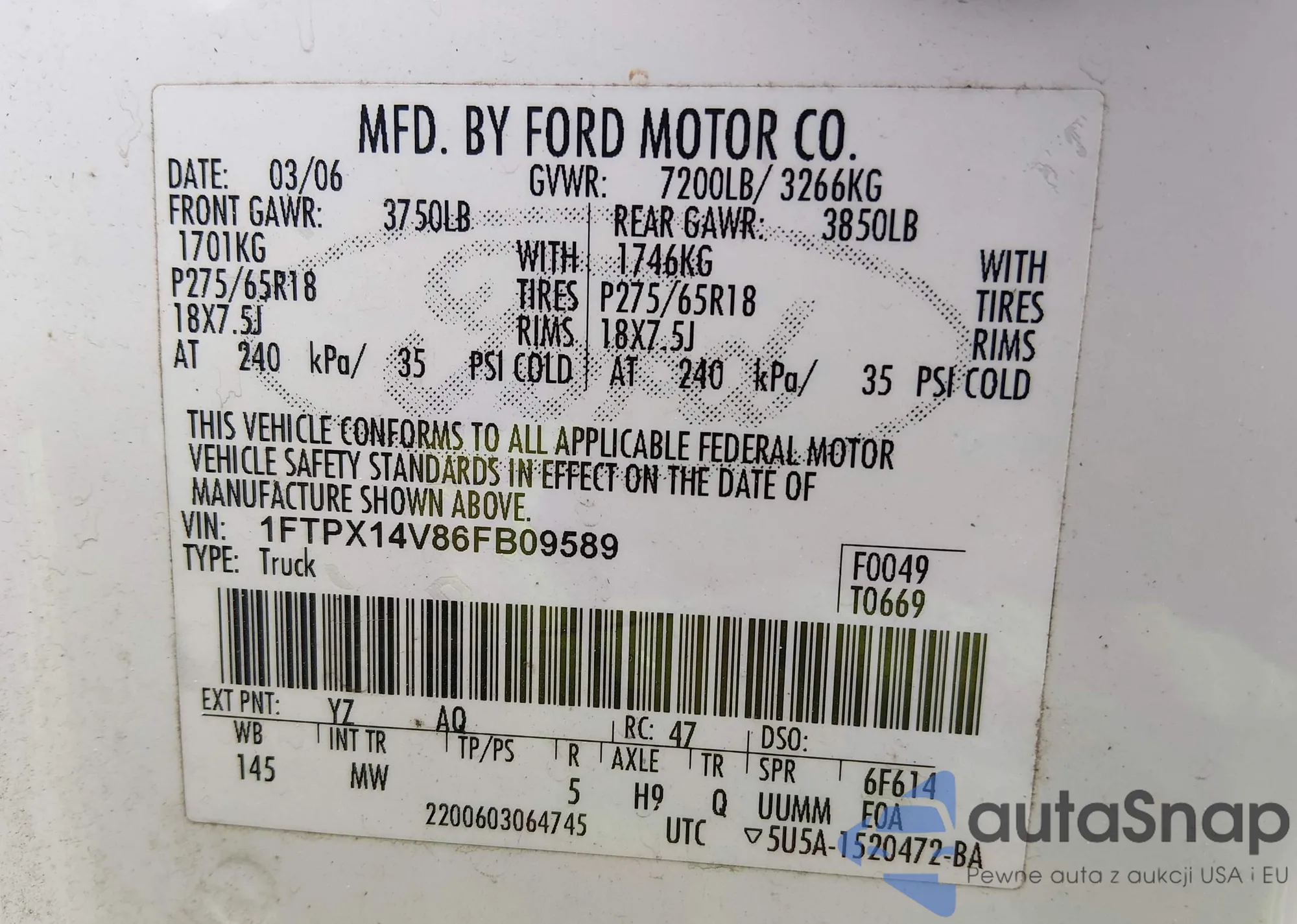 LOT: 44280294 VIN: 1FTPX14V86FB09589
