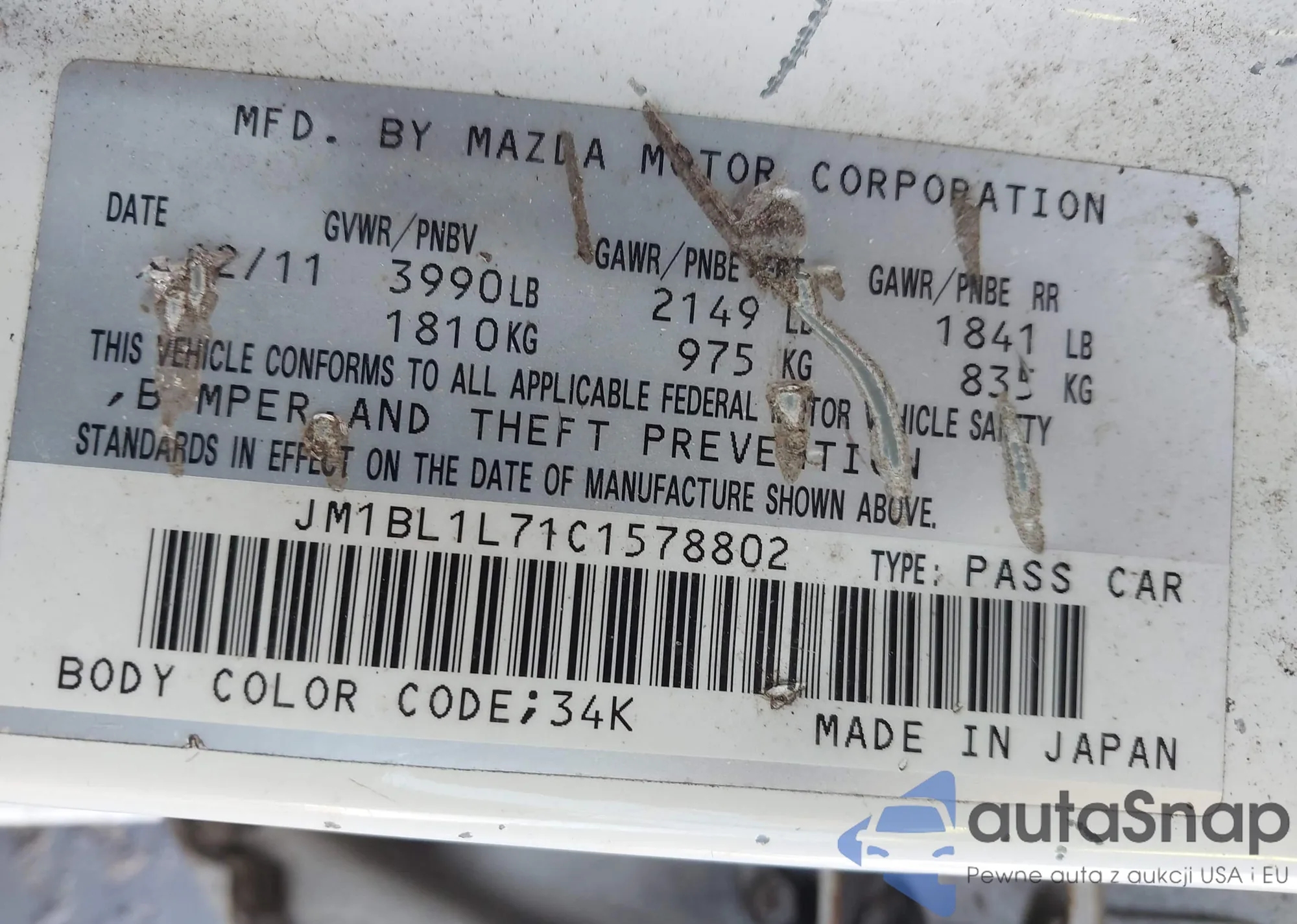 LOT: 44237841 VIN: JM1BL1L71C1578802