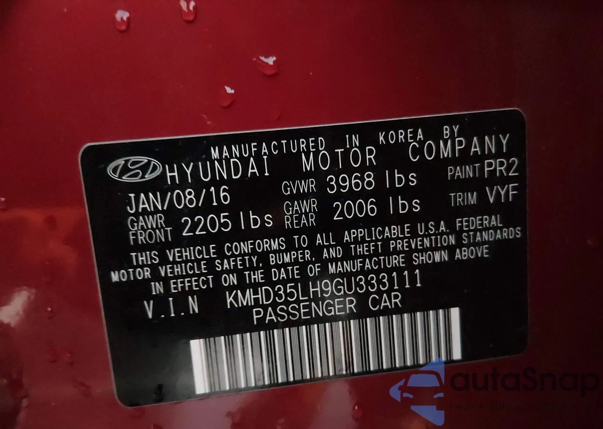 LOT: 44092095 VIN: KMHD35LH9GU333111