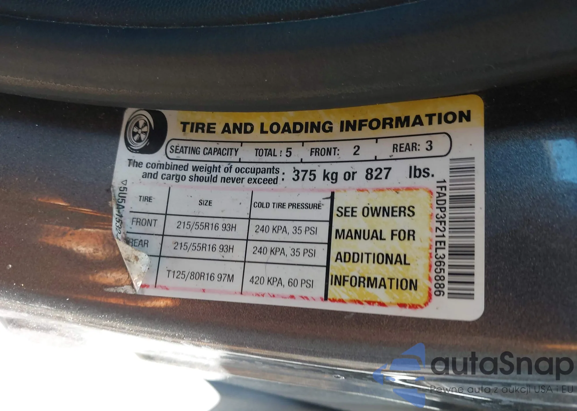 • VIN 1FADP3F21EL365886