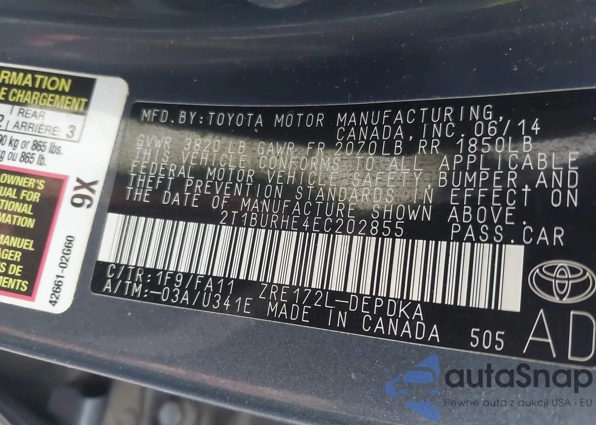 LOT: 44111854 VIN: 2T1BURHE4EC202855