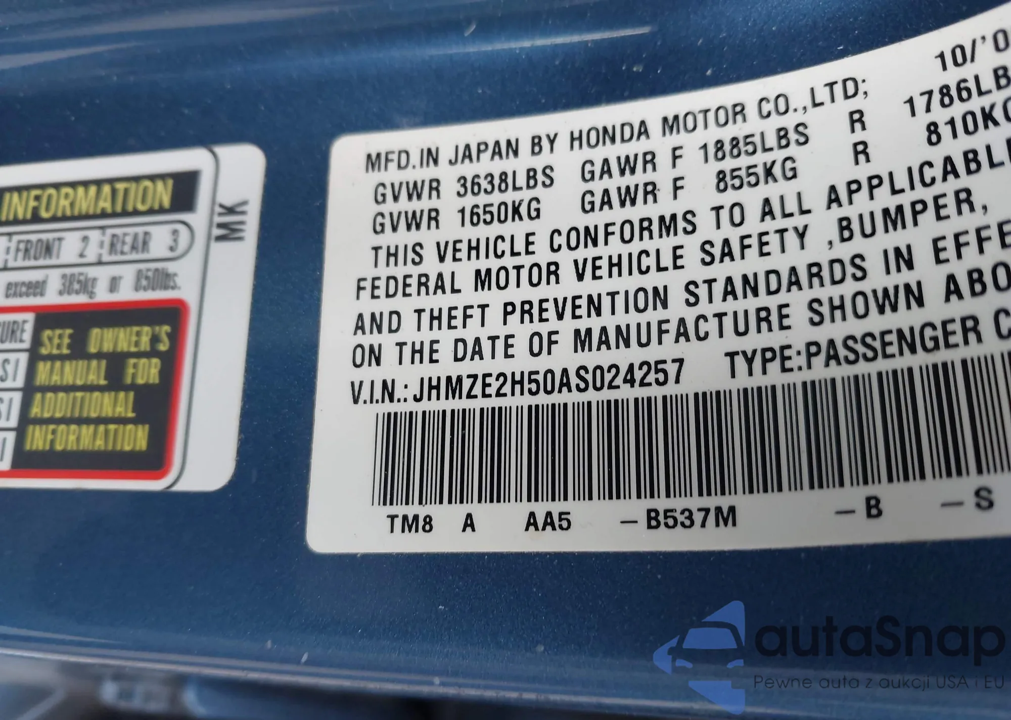 LOT: 44215393 VIN: JHMZE2H50AS024257