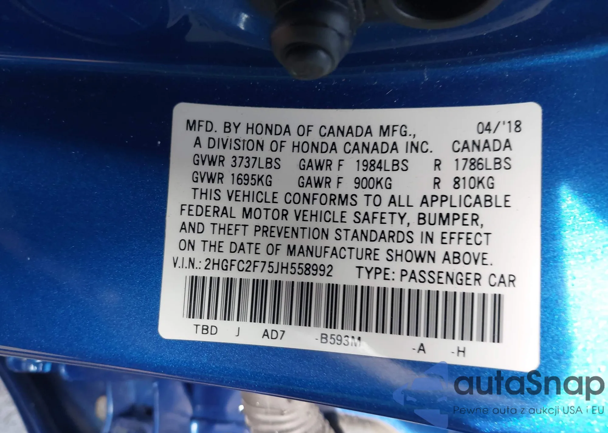 LOT: 44086322 VIN: 2HGFC2F75JH558992