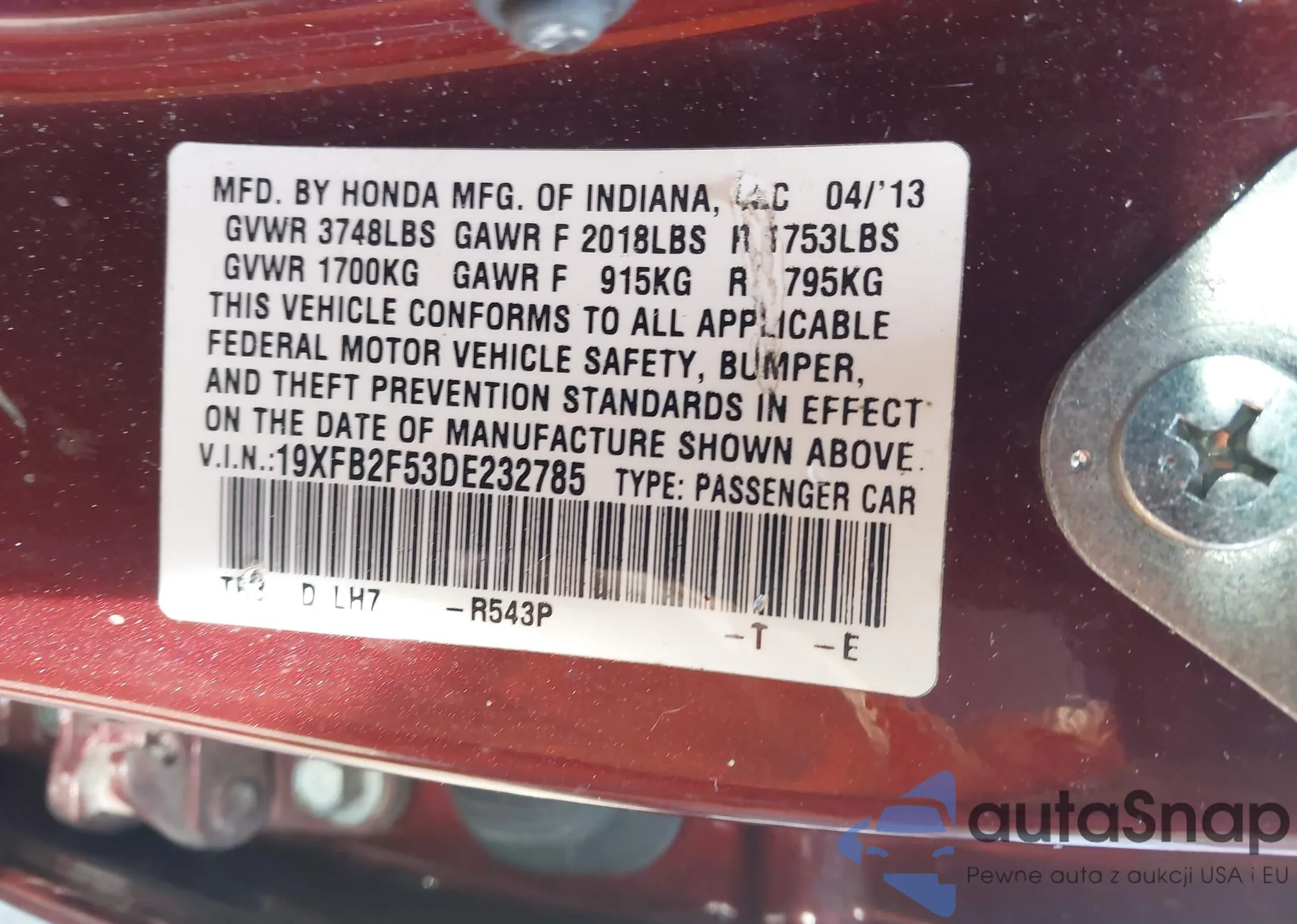 LOT: 44087566 VIN: 19XFB2F53DE232785