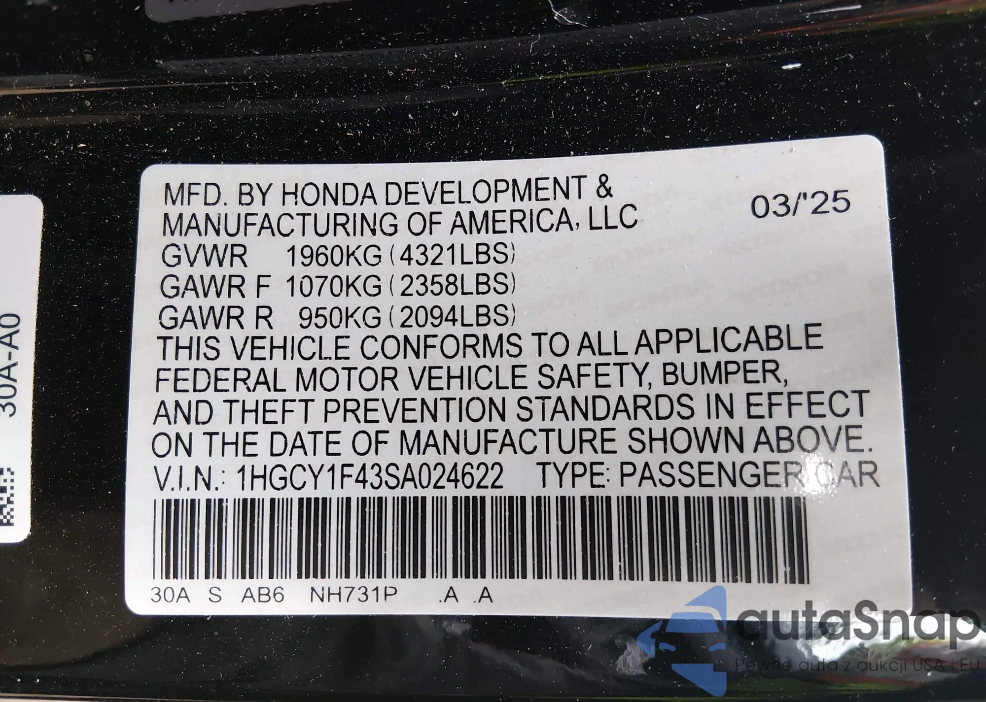• VIN 1HGCY1F43SA024622