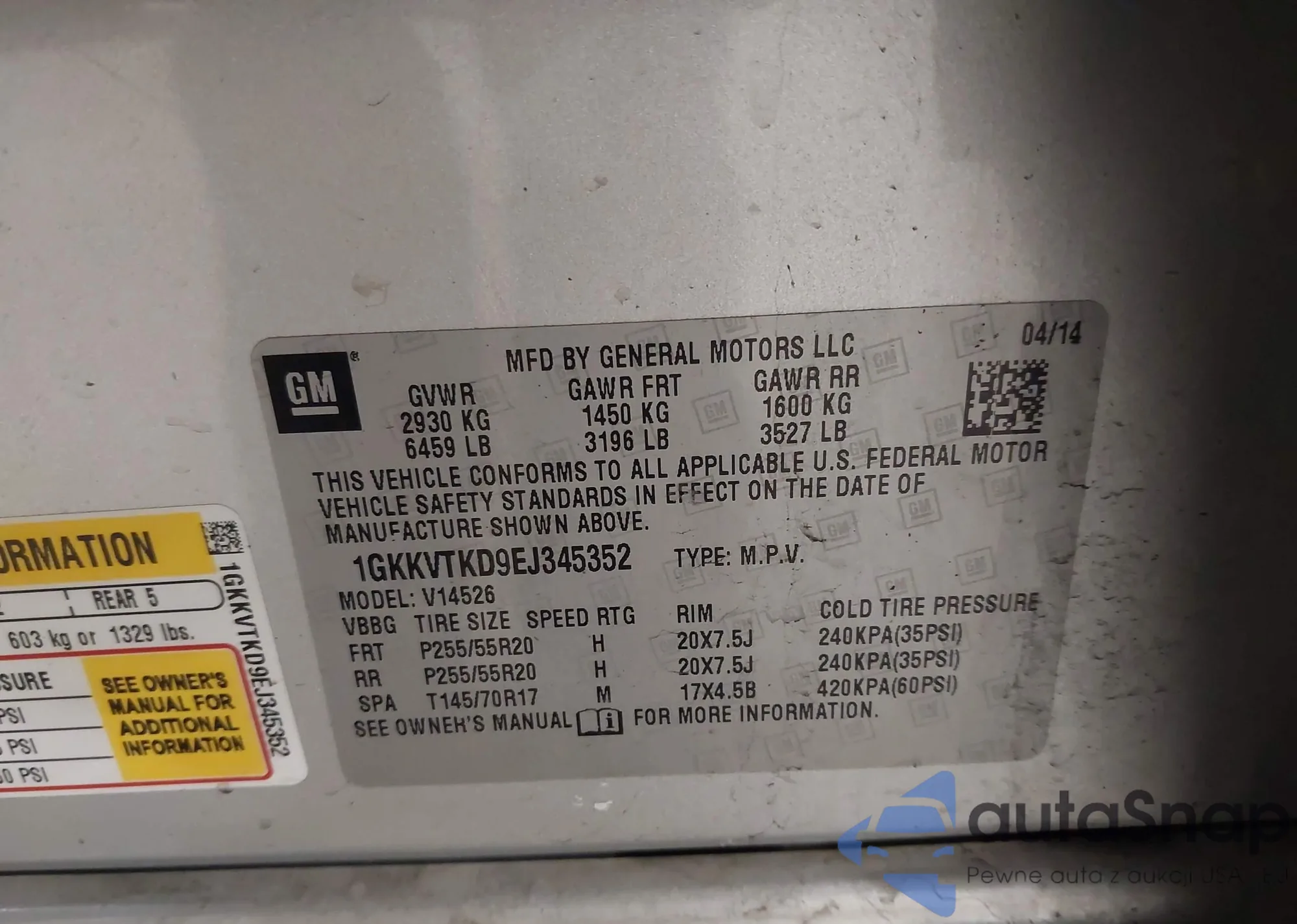 LOT: 44044919 VIN: 1GKKVTKD9EJ345352