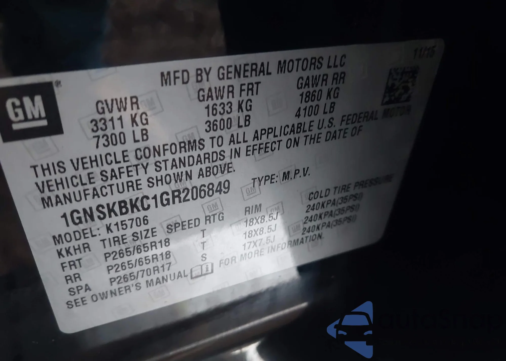 • VIN 1GNSKBKC1GR206849