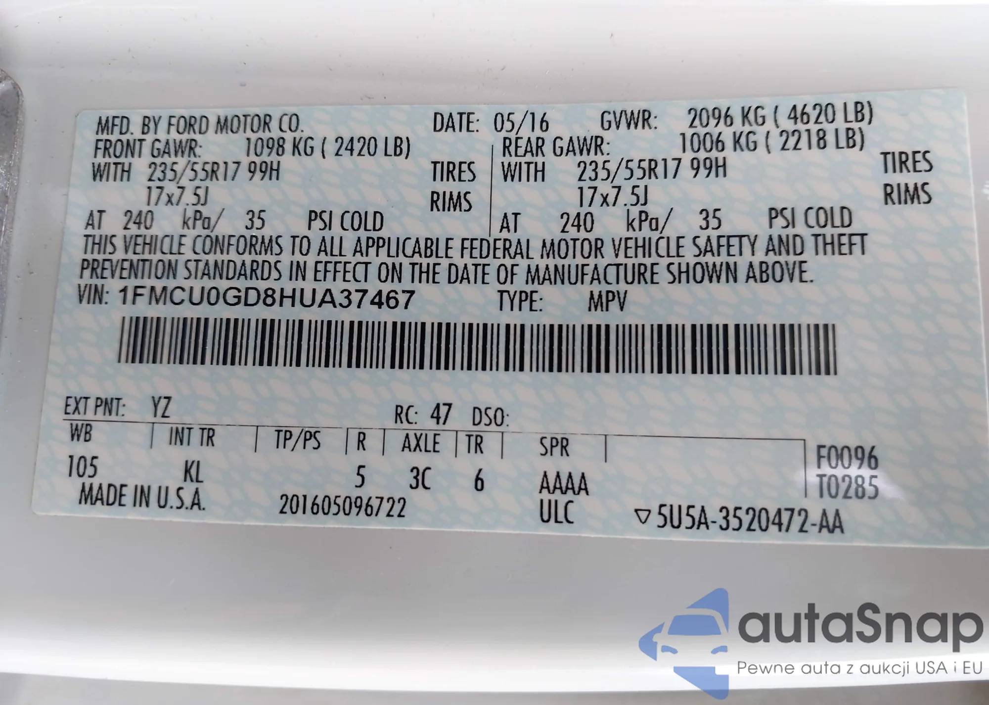 LOT: 43868503 VIN: 1HGCV1F36NA096676