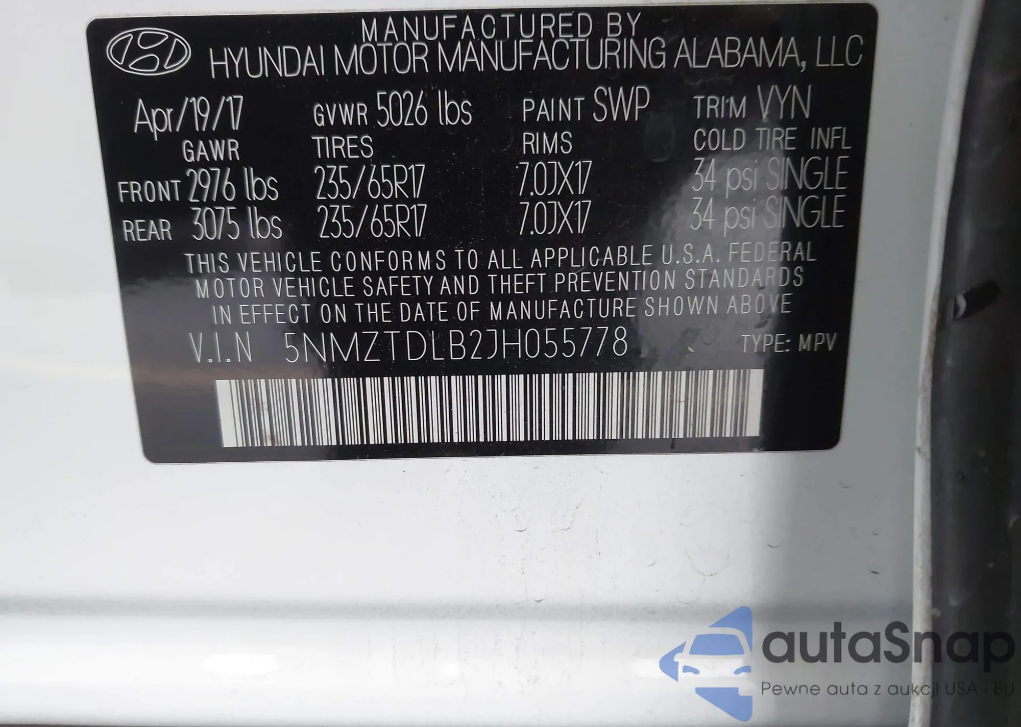 LOT: 44297131 VIN: 5NMZTDLB2JH055778